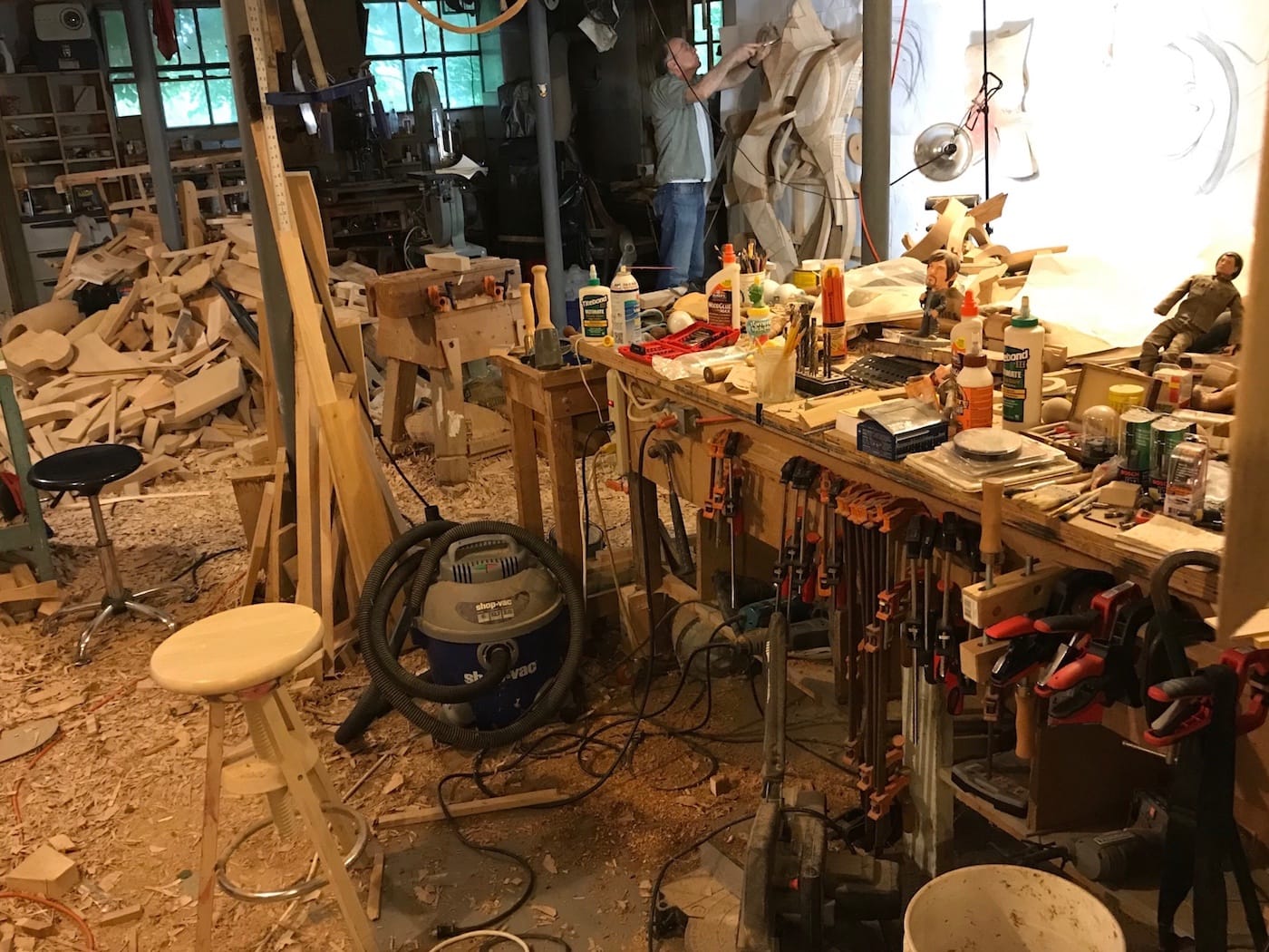 After the Streckfus taping was completed, we had lunch, and then Fred visited Stuart Abarbanel’s studio. Upon entering, he took in the sawdust scent. He took in the thin ochre powder that lightly coated the machines, hand tools, hardware, cans of solvent, glue jars, toy action figures, and abstract-looking artwork. He took in the splintered scraps and the chunks cut from one sculpture that were waiting perhaps to find their place in another. Kid-in-a-candy-store style, he took his time taking in all the “stuff” that went into his host’s creative process.