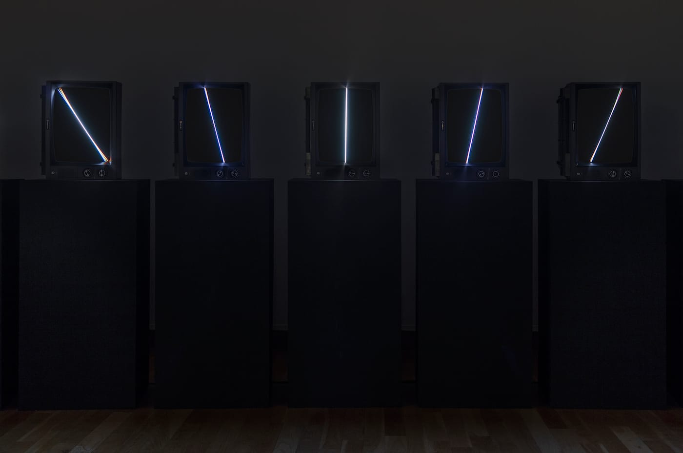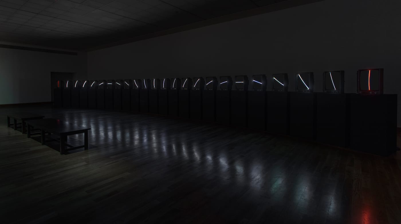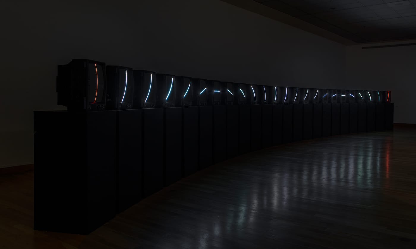 T.V. Clock is created out of Samsung TV sets from the 1980s and mounted upright on black pedestals, placed in a gentle arc across the exhibition space. Rather than have the TVs play from a videotape or disk, Paik manipulated their wiring so that a straight white line appears on each screen. Viewed together, the lines simulate the hands of a clock, each screen representing an hour of time, statically rotating its way across the installation.
