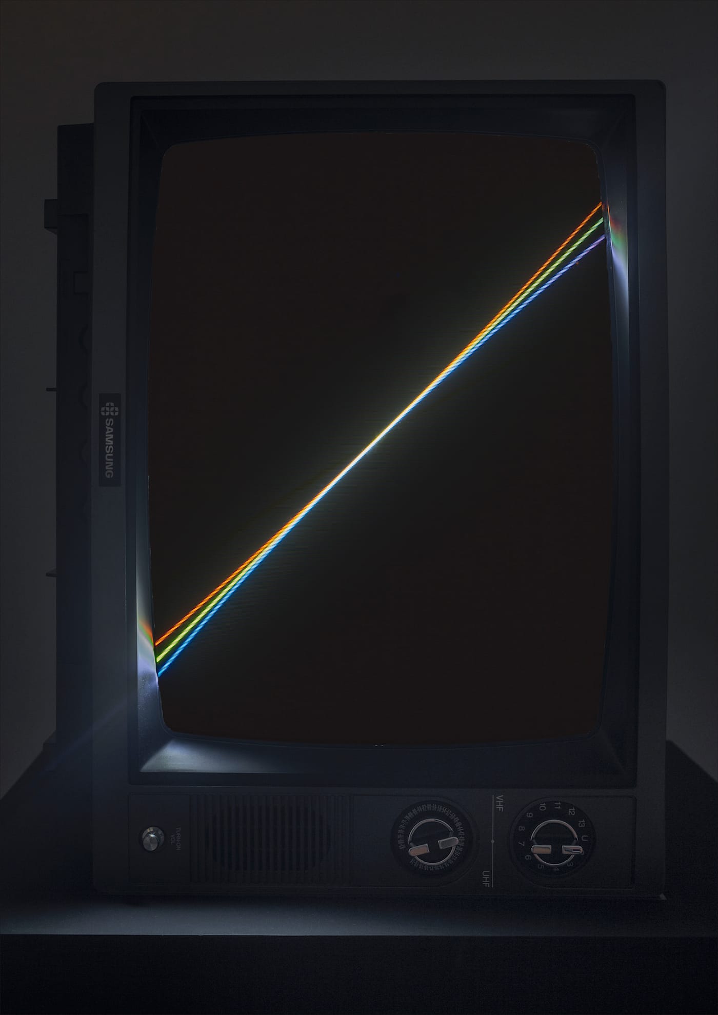 And upon approaching, much more is revealed. Up-close, the single white line is actually a set of thinner, colorful lines — one red, one green, and one blue. The beginning and end of the installation is also not strictly defined; it depends on where one enters from. The gallery’s ambiance makes the viewing experience feel temporal — a contrast against the work’s own artificiality. Importantly, Paik wanted the TVs to be seen as TVs — for viewers to feel the presence of them. While from afar the monitors may be understood as frames, up-close the commonness of the TV set, from its on/off buttons to its branding, is front and center.