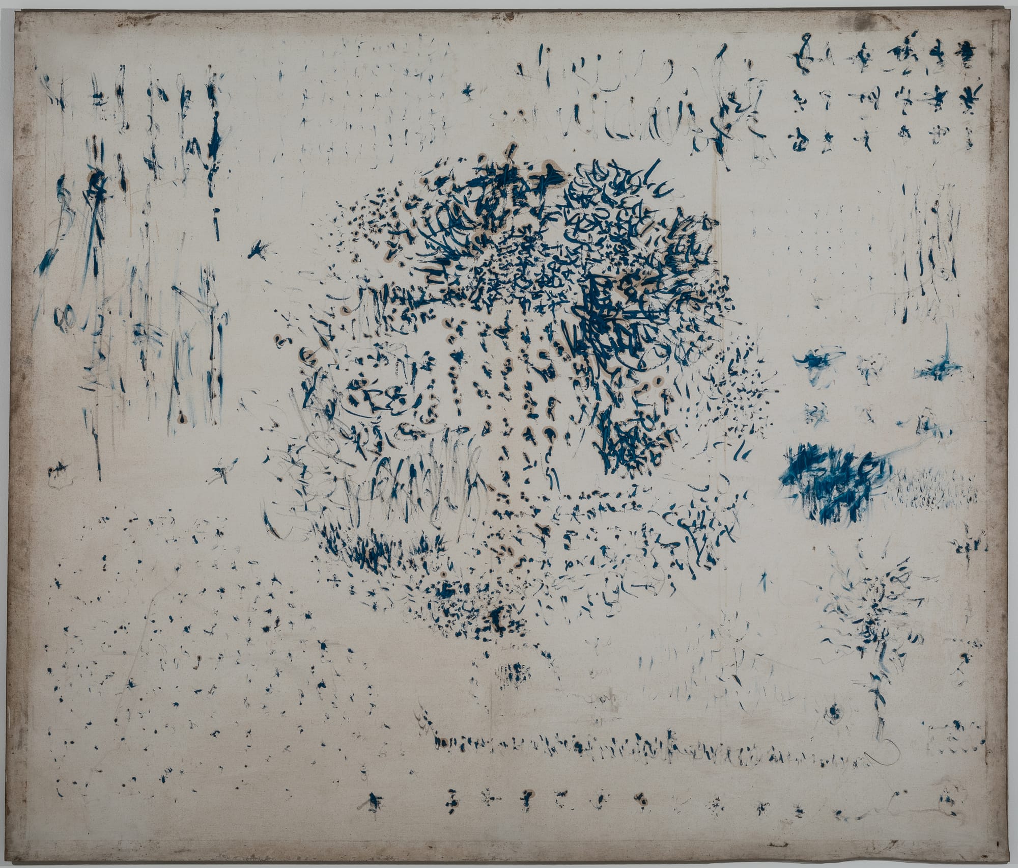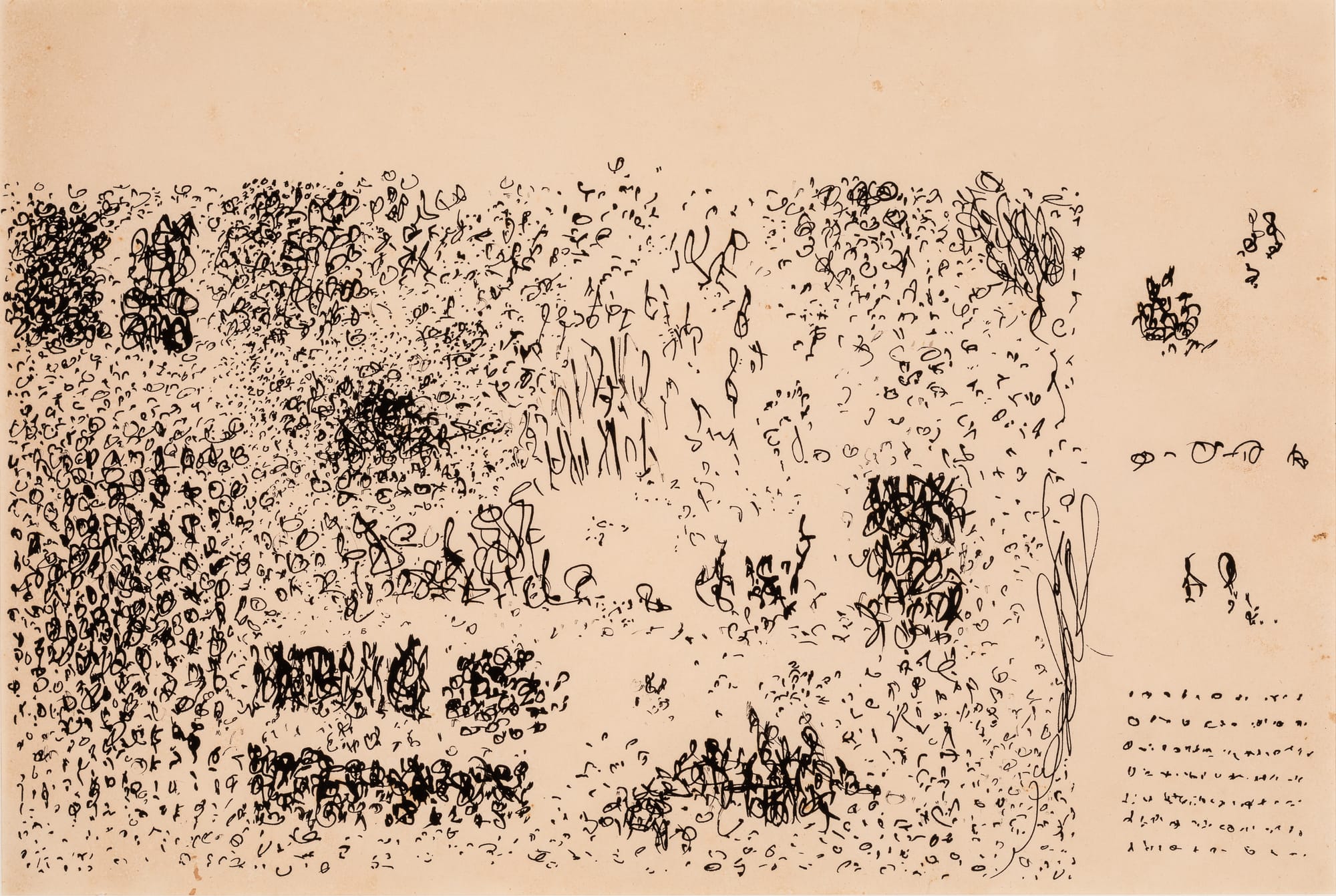 Three paintings of striking bravura are installed near the end of the exhibition. The paintings bear the characteristic trace of the artist’s hands and fingers as they dragged paint across the canvas, but they are atypical as they invert Chang’s habitual format of dark pigment on light ground. Two of the works are undated; the other is circa 1965. While it may seem natural to assume that all three works belong to the same period, this is exactly the kind of assumption that Chang turns on its head. Formal affinities dart back and forth across his production, such that intimate links are forged between works otherwise distanced by time. A poem drafted in pen on a small piece of paper, “Different Groups of People” (1978), depicts separate clusters of the Thai word for “person” (khon, คน). Its structure echoes that of “Untitled,” a sophisticated canvas of blue and black abstracted calligraphic marks on a white background painted three years earlier; it is one of the exhibition’s most alluring works and emblematic of Chang’s formal brilliance, embodying both poet and painter.