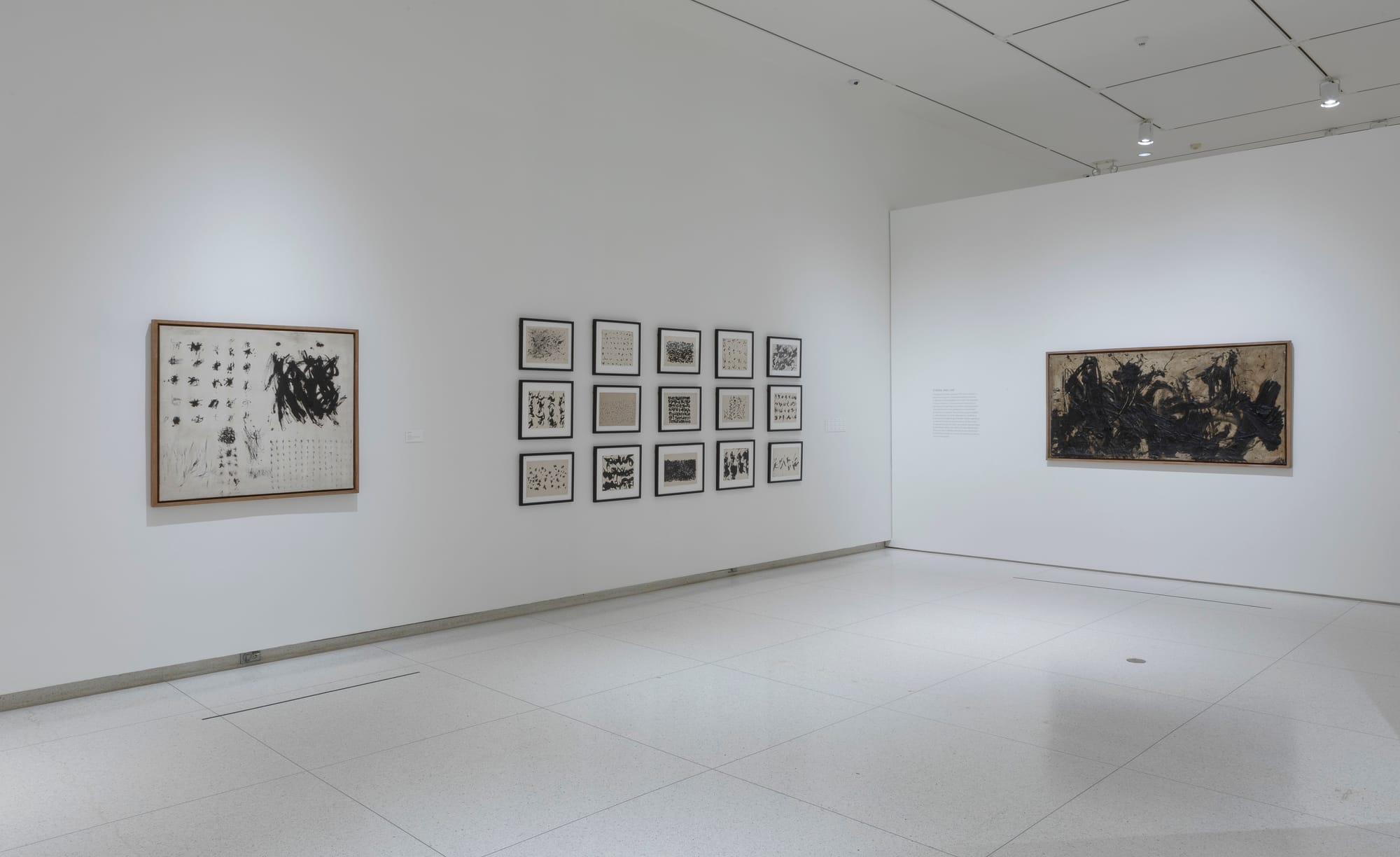 Although the exhibition roughly isolates three distinct techniques within Chang’s practice — purely abstract painting, poems and “poem-drawings,” and a hybrid of both — it insists on the abiding influence of poetic strategies on his paintings and of painting on his writings throughout his life, rather than positing that one discipline led to another. Cacchione achieves this by deviating from the chronological curatorial model in several instances, displaying works from different periods side by side to illustrate the extent to which paint and verse were intertwined. Adjacent to the aforementioned oil paintings from ca. 1963 and 1965, for example, is a wall of ink on paper works dating from 1971 and 1972; on the other side of the same partition hang two additional ink works of similarly lush contrast painted in 1960, a return to the beginning of Chang’s experiments in abstract painting.