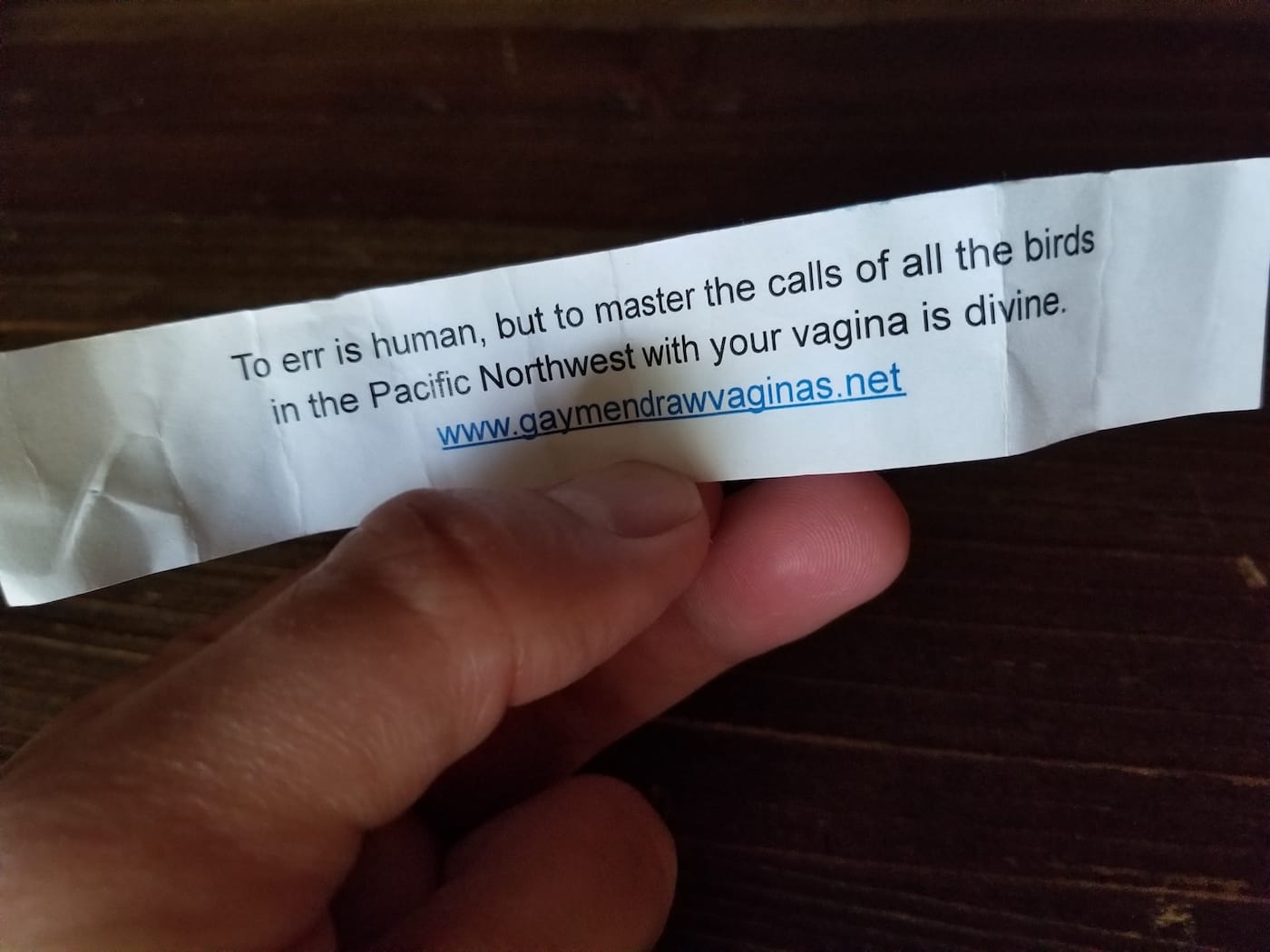 In 2014, Breezy Circle published an insightful and hilarious anthropological book called Gay Men Draw Vaginas, and at the book fair they had what appeared to be an astounding selection of works centered on various gender and body subjects. Yet, every time I passed by, there was a throng of visitors crowding the table and I couldn’t quite elbow my way in. My wife, however, was able to visit, and was rewarded with one of the Vaginal Fortunes they were giving out. Hers read: “To err is human, but to master the calls of all the birds in the Pacific Northwest with your vagina is divine.” She loves birds and lived in Portland, so she thinks it accurately forecast her vagina as best any fortune could manage. So, of course, we’re getting it framed.