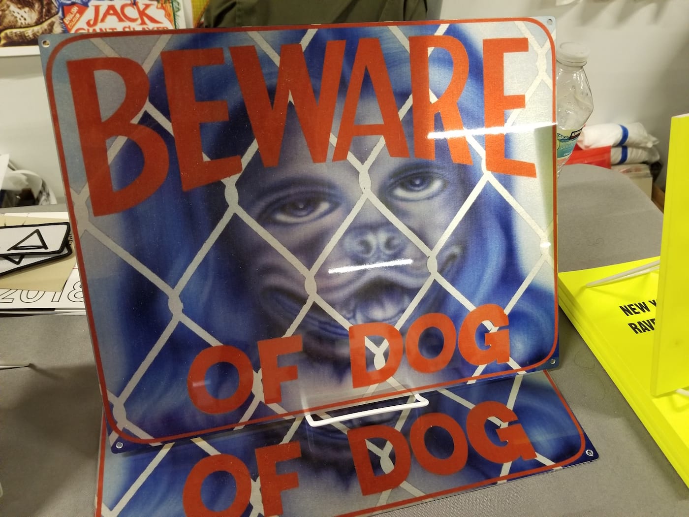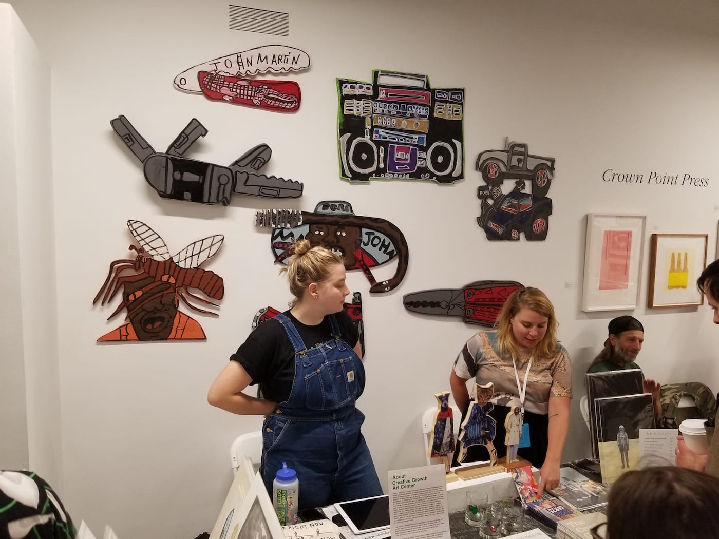 Creative Growth is a nonprofit gallery space that provides services and opportunities for artists with developmental, mental, and physical disabilities. Many of the publications featured their artists’ work, which reminded me of pieces that came out of the early years of the celebrated MFA program at UC Davis –– think the loose clay work of Robert Arneson and David Gilhooly, or the cartoonishness of Roy De Forest. For example, the paintings on wood by John Martin, arranged on the wall behind the table, exuded the effervescence and mythmaking qualities of the witty Nut artists. One work in particular featured a self-portrait of the artist attacked by a flying insect.
