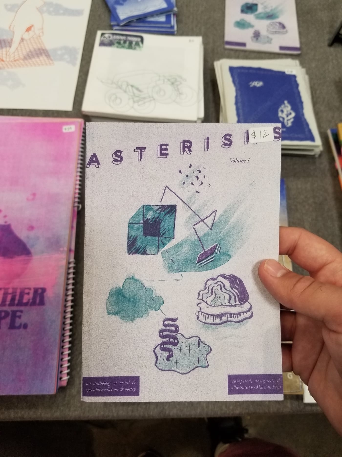 Martian Press is the brainchild of artist and printer Stephanie Lane Gage, formerly based out of Milwaukee and currently located in Los Angeles. Speculative fiction and poetry are the primary focus at Martian, exemplified by its lit journal, Asterisms, which contains dozens of new and original writers whose work adroitly plays with sci-fi and horror tropes while exploring contemporary social justice issues. Especially cool, however, was a zine that Gage authored, titled Are You or Someone You Know Experiencing Paranormal Activity in Your Home or Business?. The work graphically interprets her poem about spectral hauntings through the lens of mental health awareness.