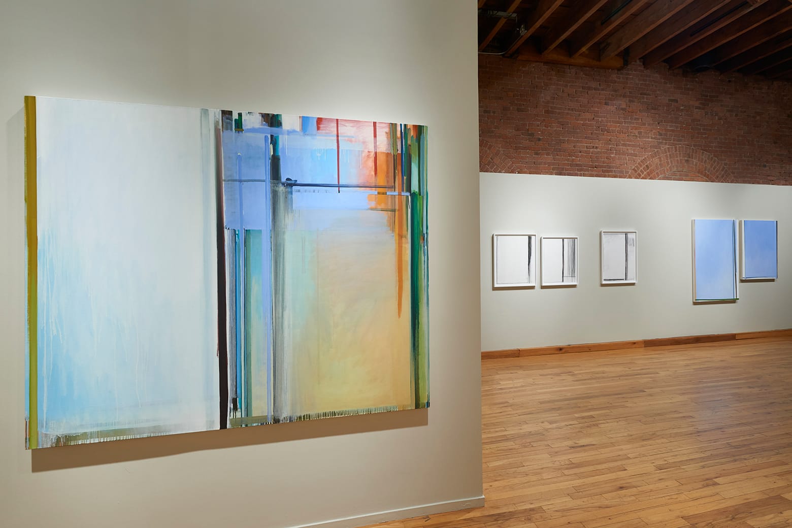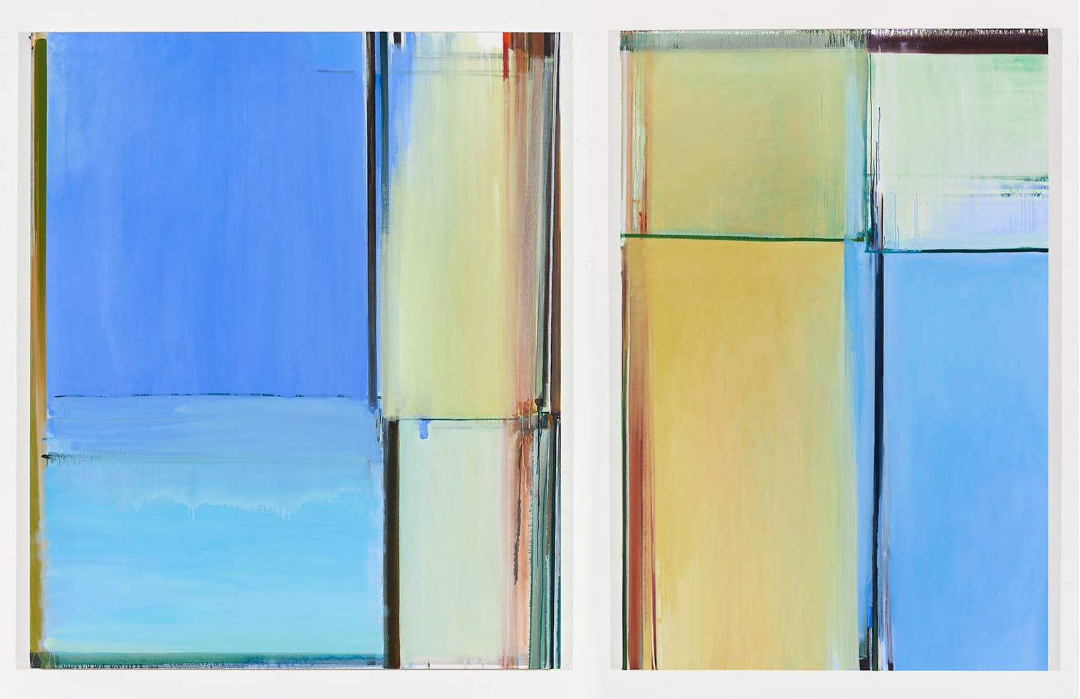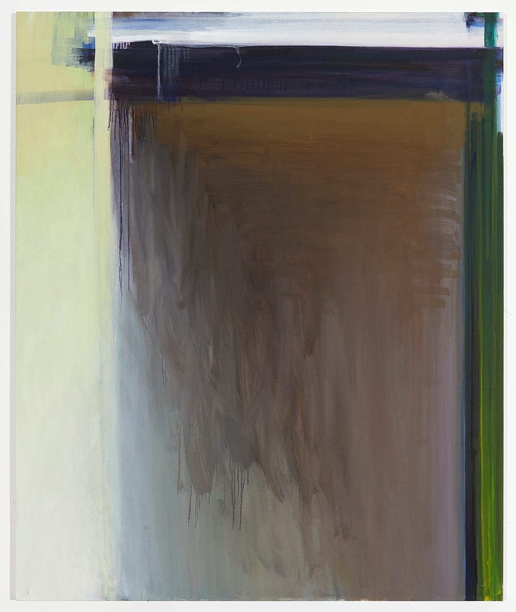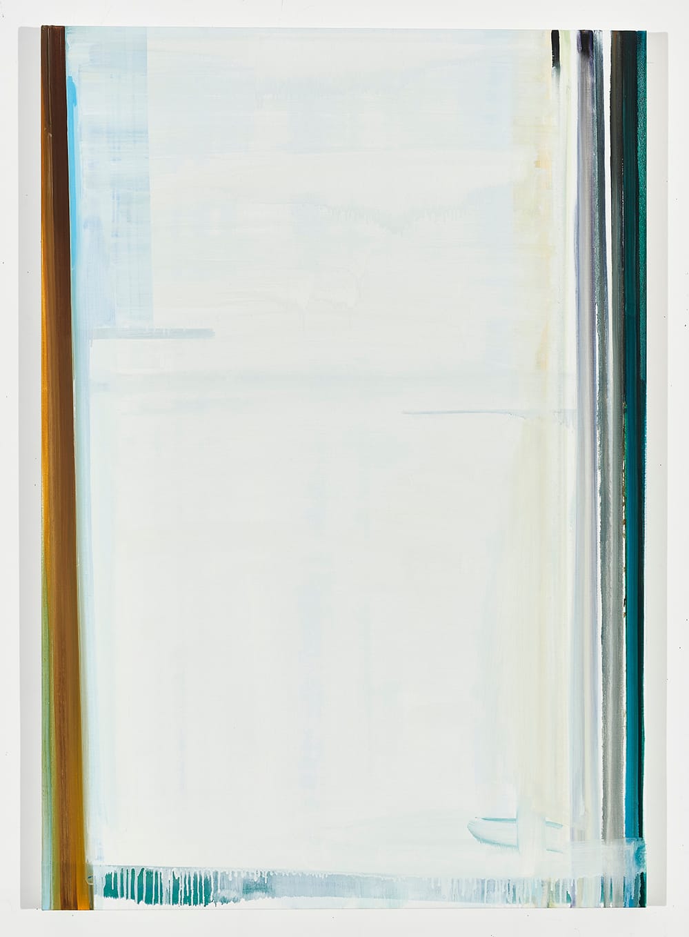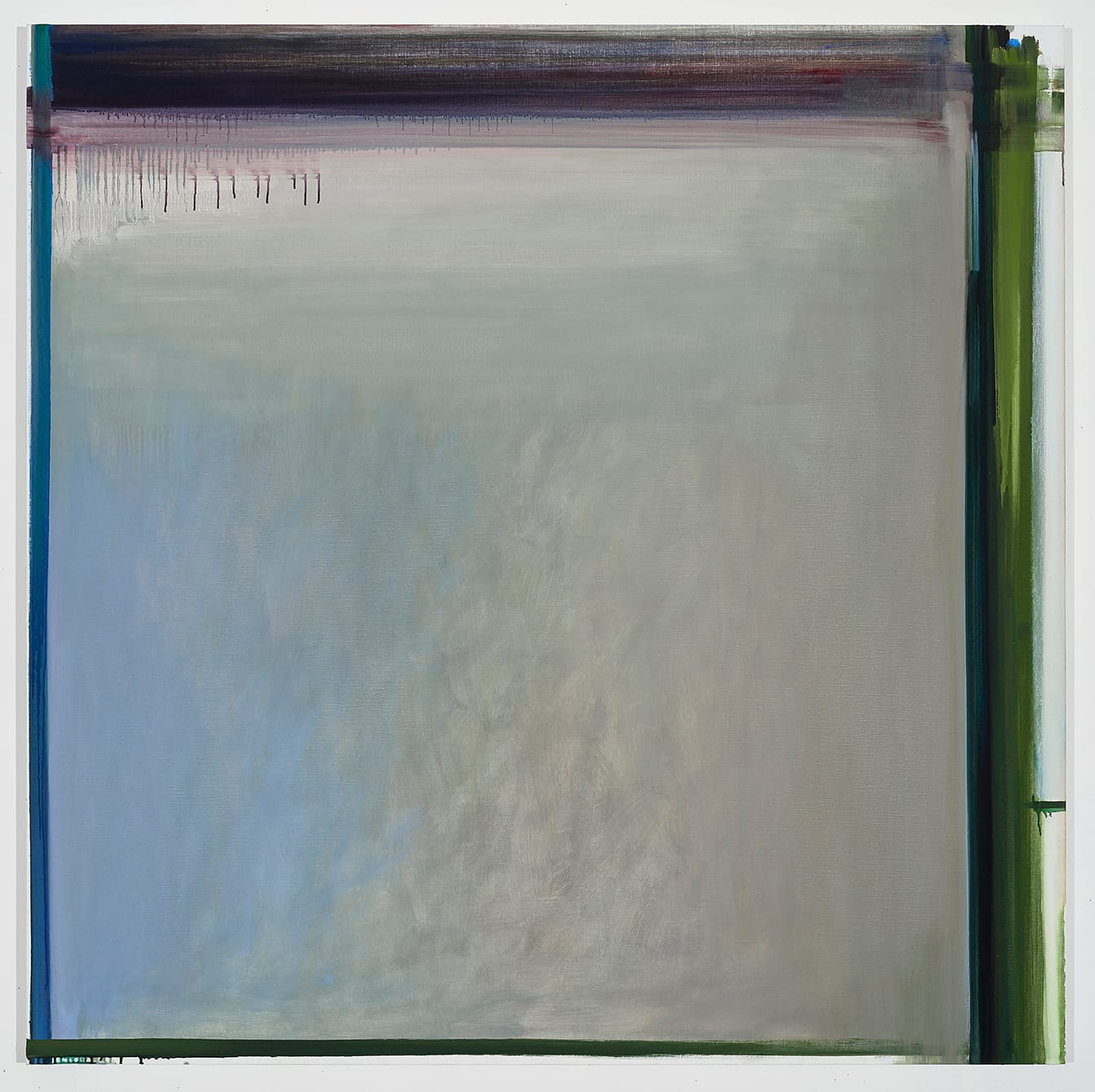 Several of the paintings have minimal, blindingly white, or sky-blue surfaces abutted by windshield green, mustard, or gray borders. With raw, dodged, and burned edges that accentuate the framing device, these austere canvases resemble celluloid strips. “Untitled (Nocturne)” (2016) has the beautiful, murky surface of a streaked window pane rendered in chocolate, feathery strokes. The split format and diptych paintings, lodged with traces of underpainting and obscuring veils, consist of floating planes in high-key twilight and sunset hues. The diptychs, with mismatched outer dimensions and square-within-square compositions, may be derived from actual window banks or lifted from sections of other paintings.