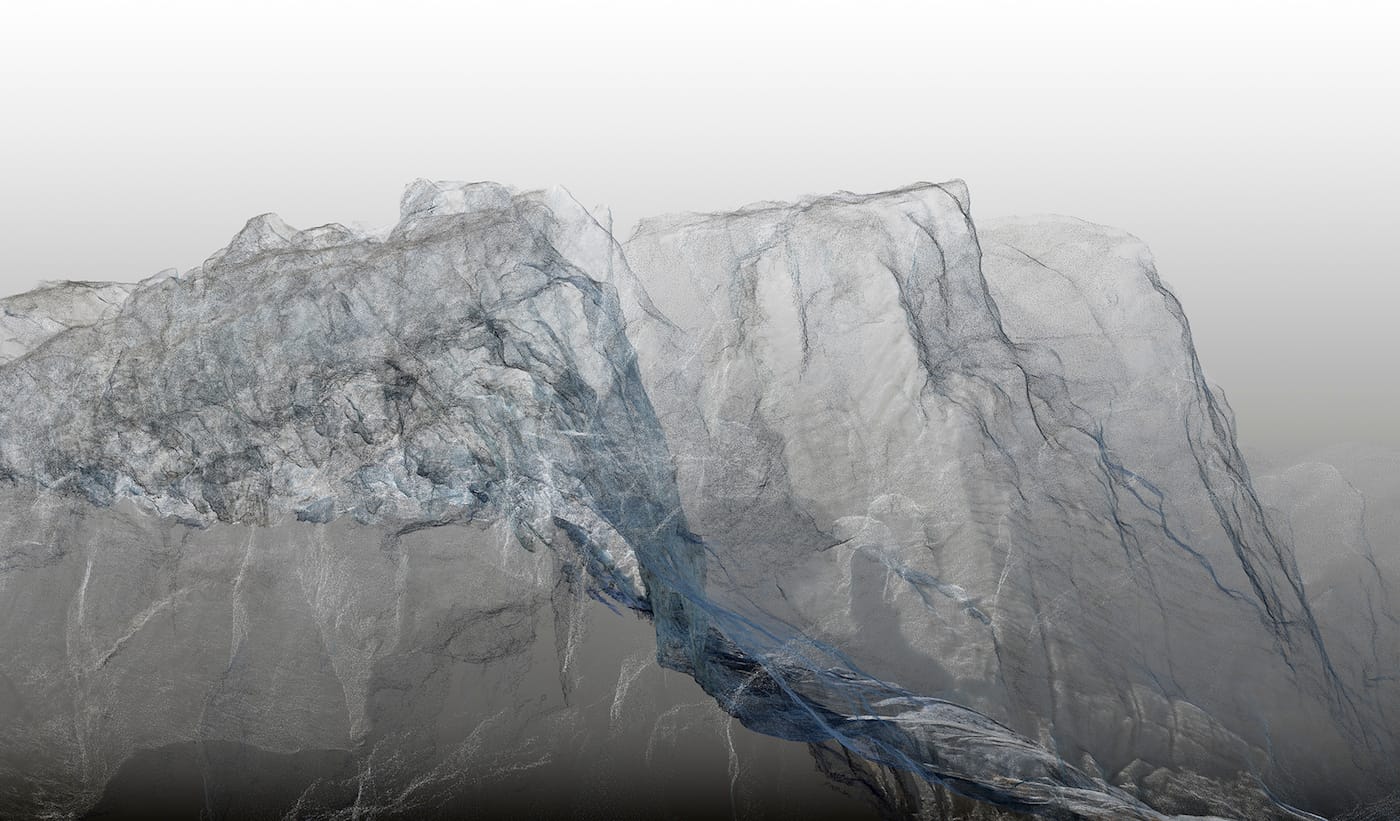 Contemporary photographers are pressed to consider how to uniquely communicate through their medium to audiences in which everyone totes a camera. Artist Dan Holdsworth captured 3D imagery of Bossons Glacier in the Alps by drone. For “Bossons Glacier no. 16” (2016), the artist used the latest photogrammetric and geo-cartographic innovations to trace the contours of the glacier, with each pixelated point colored and edited by his hand. The intervention endows the monumental and ancient formation with the fragility of silk and intangibility of fog. Capturing the vulnerability of the environment’s grandest spaces in this manner quickly unravels their perceived permanence.