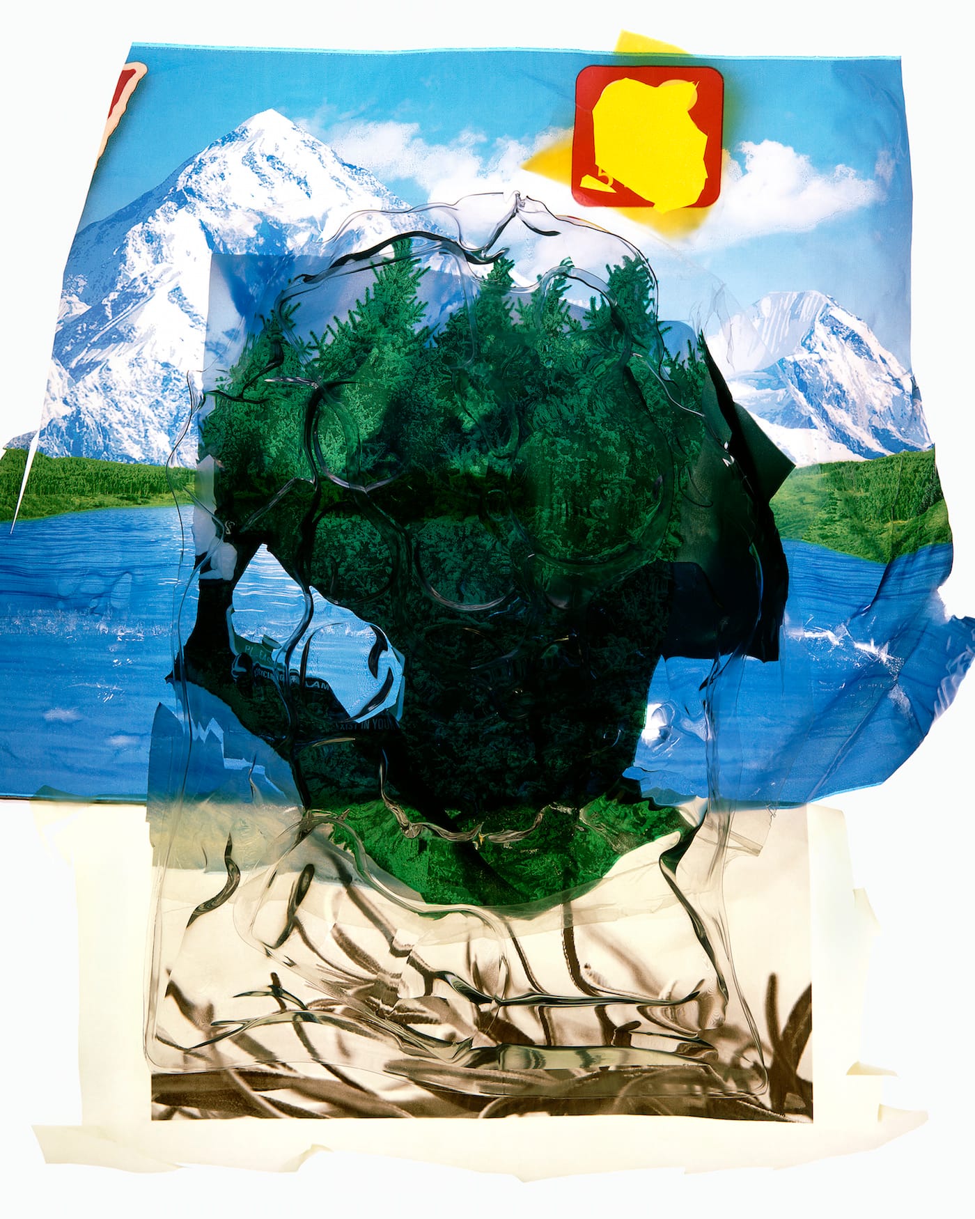 Artist Gary Emrich refutes our presumed familiarity with the land in “All Consumed #37” (2017) by manipulating the blue alpine lakes presented in water bottle labels. The ideal landscapes promoted by the water manufacturers are undermined as Emrich adds more plastic to his images: packaging bubbles are injected with water and layered on top of the labels to produce a distorted effect. The edges of the vista fold and crop, demonstrating that the earth’s bounty as a commodity is limited.