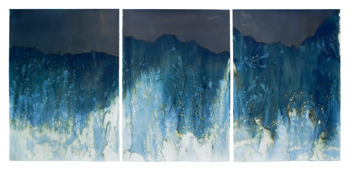 One of the most exciting moments in the show comes from artist Meghann Riepenhoff‘s cyanotype “Littoral Drift #848” (2017). After exposing the photosensitive paper only to sky, she bathed the image in the ocean’s surf. The minerals and mold in the living water interacted with chemicals on the photograph’s surface, producing a gritty texture and a memory of the sky rendered by the tide. The color of the photo undulates and bubbles, capturing a whisper of the energy and evolution of nature’s elements. René Descartes was correct to insist that pictures can fully represent objects or actions when they fail to resemble them. The vicissitudes of the landscape are thus captured by the photographers documenting it.