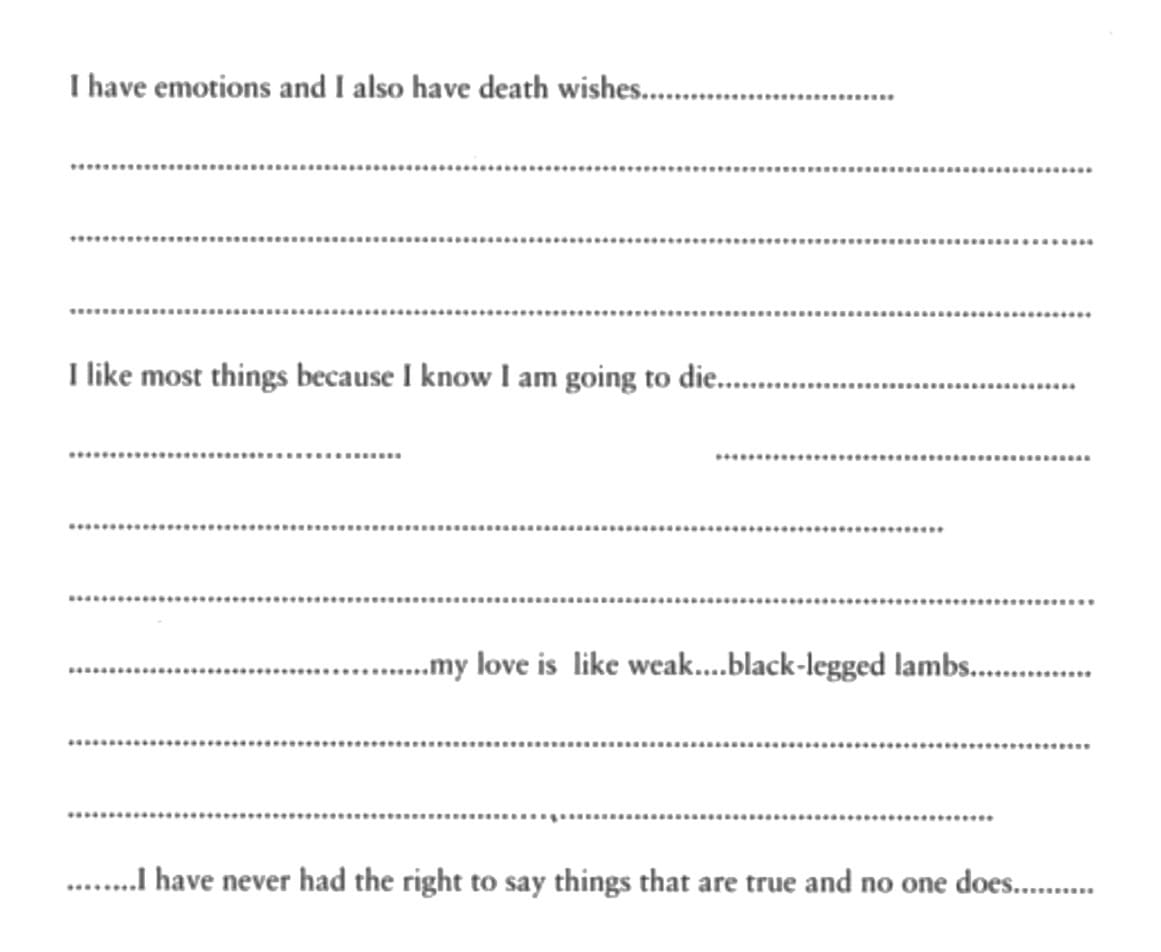Those ellipses mark out space and time in a new way, functioning both as a graphically emphatic but asemic presence on the page, and as the marker of some absence, delay, or silence. This elliptical visibility functions quite differently from the empty page space, visually evident in its own way, that Mallarmé began exploring in Un Coup de Dés and that became increasingly familiar in American poetry with the spread of Charles Olson’s idea of projective verse. As Sasha Steensen perceptively put it in a review of Bad Bad for the Boston Review, “Hesitation, resolution, omission, inclusion, decoration, and punctuation, the ellipses are, on the one hand, the bullet-holes that remain after Minnis’s speaker takes shots at the reader. On the other, they are evidence of the unsteadiness of the speaker’s own hand … These lines embody the vulnerability that so often lurks behind the book’s defiance.”