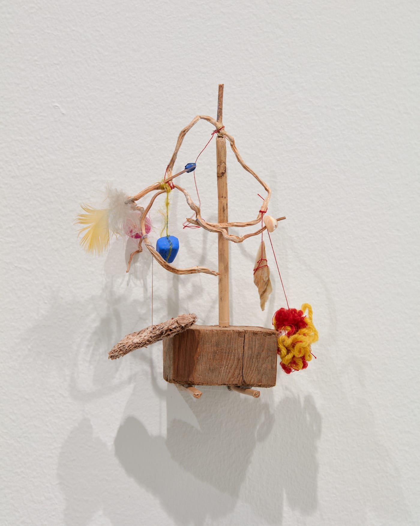 “Undoing completes the doing,” Vicuña writes in the catalogue. As unassuming as a stick planted along the shoreline, los precarios are plotted into landscapes where wind or water will wash them away. Bound by bone, shell, and thread, these small sculptures are made of feathers and pebbles, seeds and beads; their marrow is driftwood and tumbleweed. Here a cross, there a swirl — a feather frozen in flight, a tangled attempt at ignition. These balancing acts cast shadows that sway. “We are made of throwaways and we will be thrown away,” writes Vicuña.
