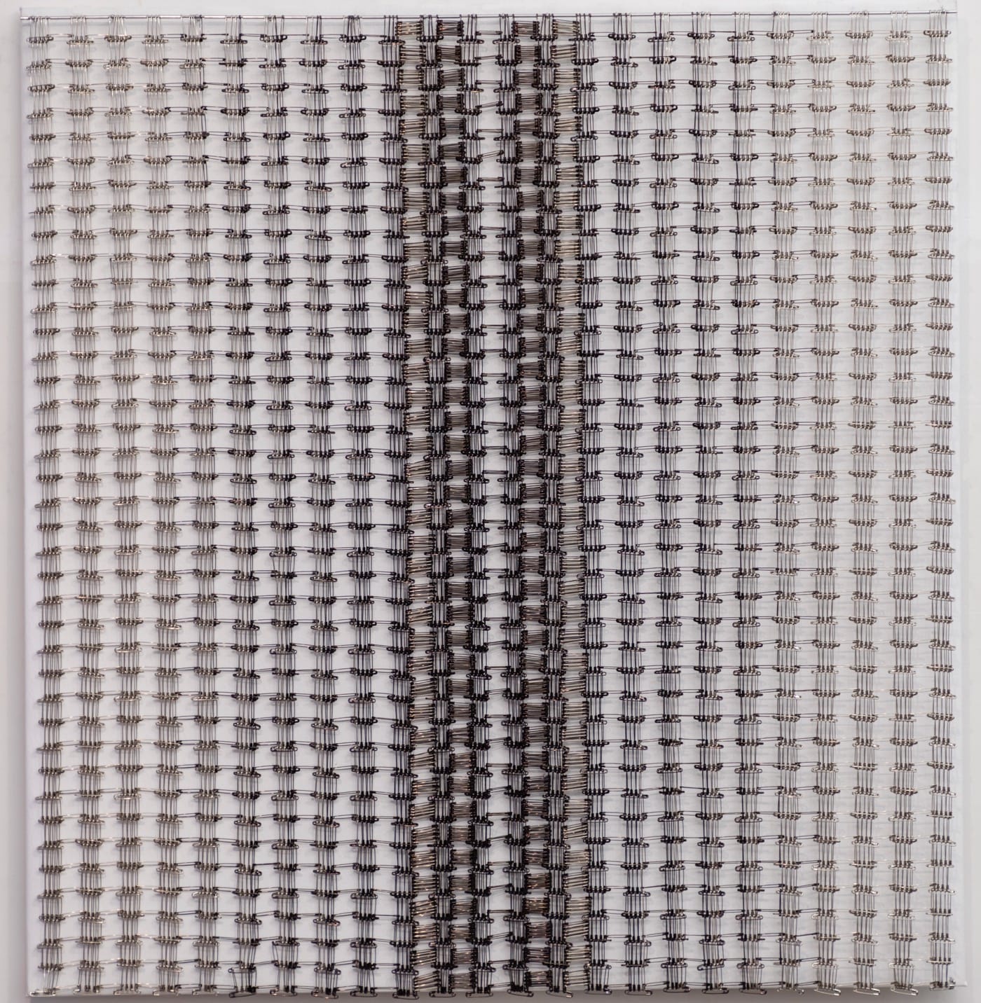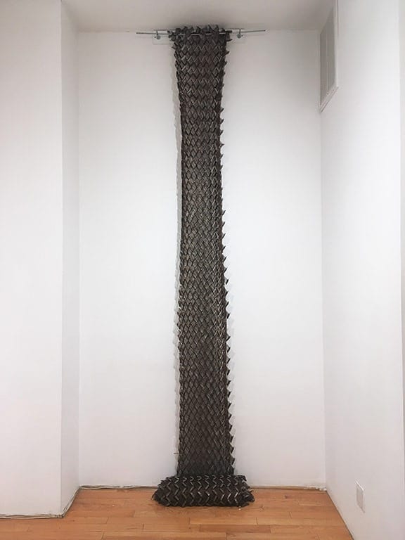The Permutations exhibition currently on display at Garvey Simon gallery is very much about Tamiko Kawata’s meticulous manipulation of unassuming, everyday materials. At the same time, it is about a rigorously modernist practice that walks the bridge between the 1960s — when Kawata moved to New York and began working with the safety pins prominently featured here — and now, where the strategy of accumulative aggregation still continues to fascinate artists, fans, and writers. We rarely tire of perceiving the relationship between the snowflake and the storm, because the individual unit suggests infinity in a way that can actually be held without triggering cognitive dissonance. In the flat, placid grid of the piece “Permutation 8” (2018) the pins interlock in a skein that might indeed go on forever, evoking a chiasmus of the line from the famous William Blake poem. It’s not “see[ing] a world in a grain of sand”; but rather, seeing in a grain of sand (the possibilities of) a world. And in Kawata’s world, pins linked in regimented ranks can become a scroll 25 feet long, such as in “Installation Piece (2018). They might form conglomerated castles that have oxidized into ruins as in “Twelve Arms” (2015), and convoluted mobius strips as in the “Unknown” pieces (both large and small made this year).