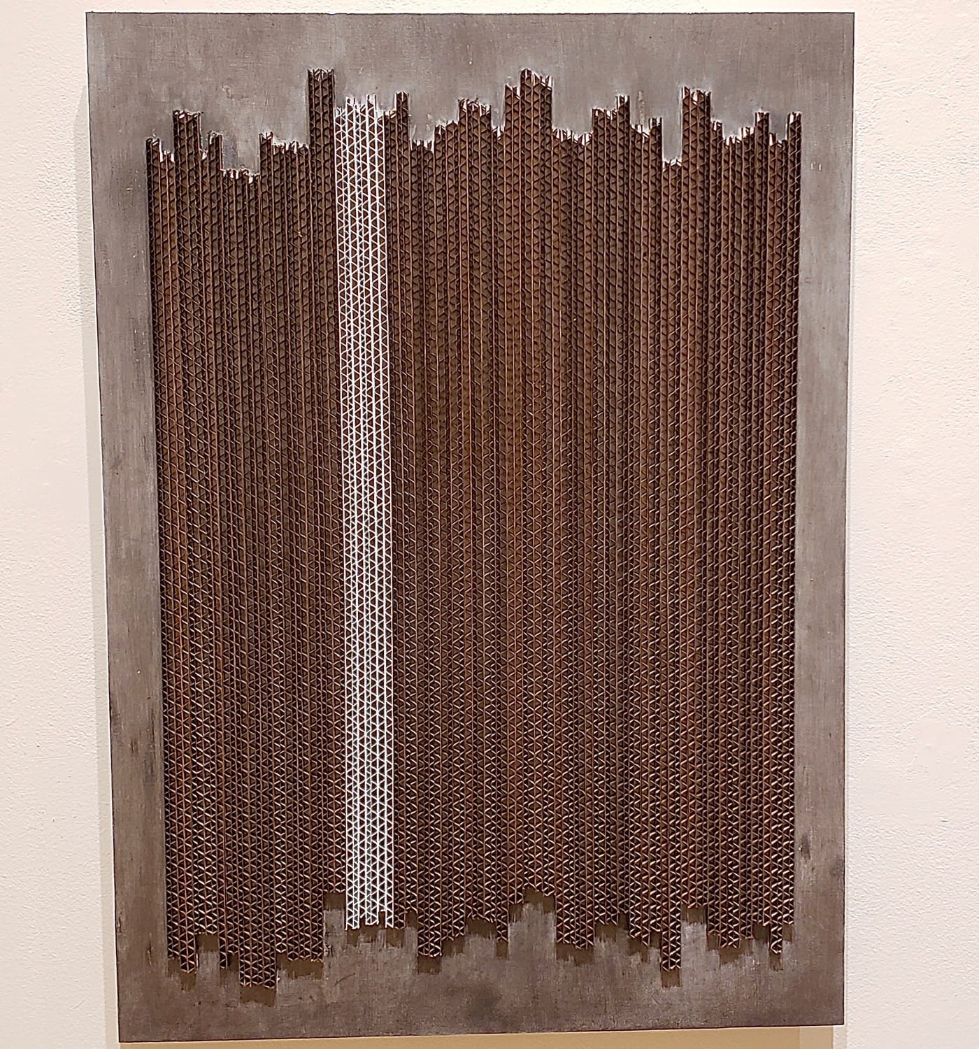 Kawata takes an alternate tact, making intricate works small enough that we can imagine what it takes to put them together by hand, and thus are less about macho, muscle flexing bravado, and more about intensely explorative treatment of materials. Kawata asks the viewer to recognize the alchemic properties of the fundamental structure of corrugated cardboard. In a piece “CBL-1 City Scape” (2018), cross sections of the cardboard are laid out in a linear fashion, stacked close, with alternating lengths, the cross sections causing alterations along the horizon line. It reminds me of the silhouette of a city scape seen from miles away.