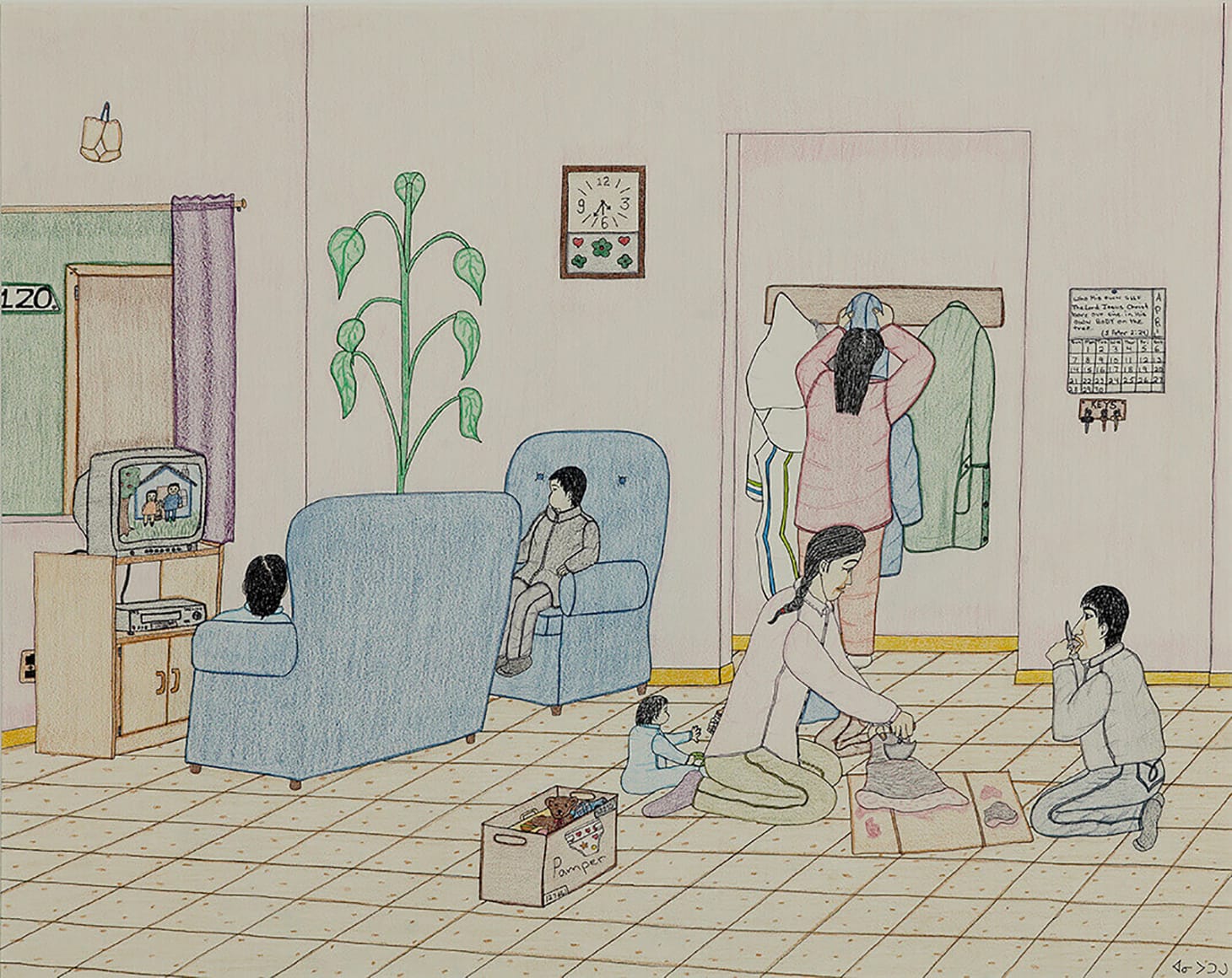 In it, Pootoogook invites the viewer into the everyday domestic reality of her Inuk First Nations community, located in Cape Dorset, near Baffin Bay, on the southern tip of Baffin Island in the Canadian Arctic. It is there at the Kinngait printmaking studio on Baffin Island where Pootoogook learned to hone her art making skills. While many in her community focus on the naturalism of the surrounding Arctic, Pootoogook looks beyond the superficial tropes of romantic landscapes, instead capturing the gritty reality of her community and the domestic modern challenges of life for First Nations living in northern Canada.
