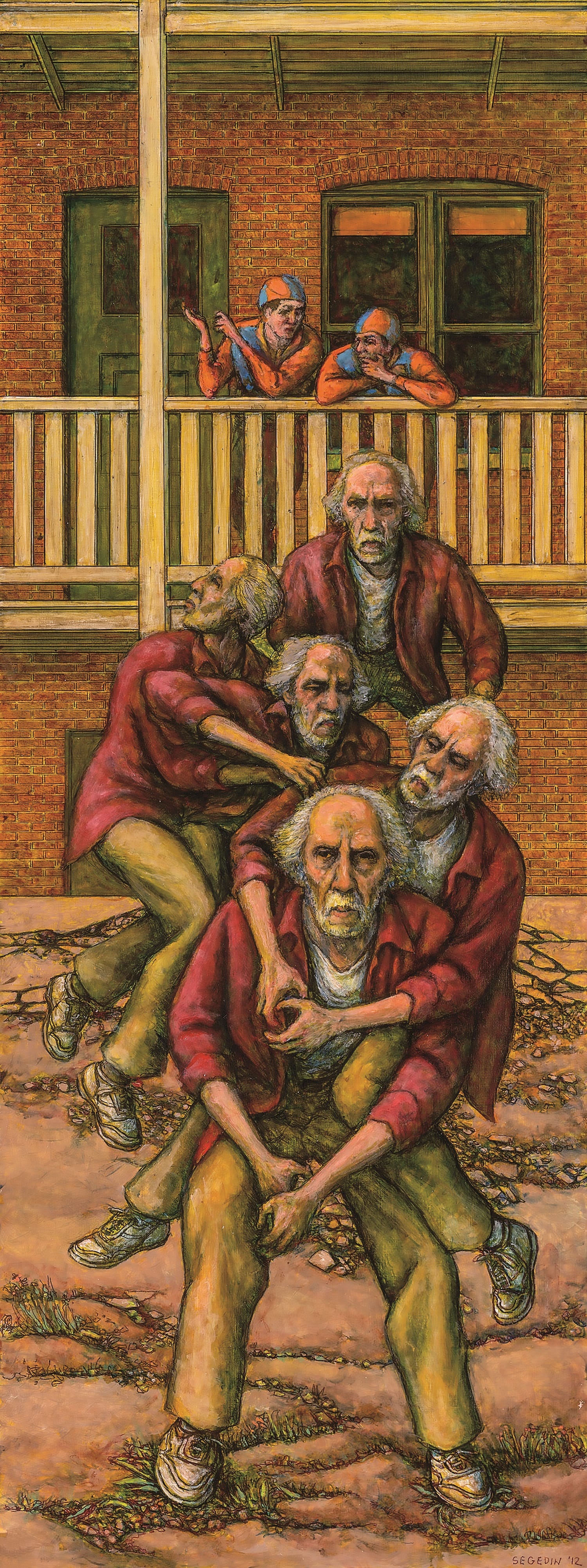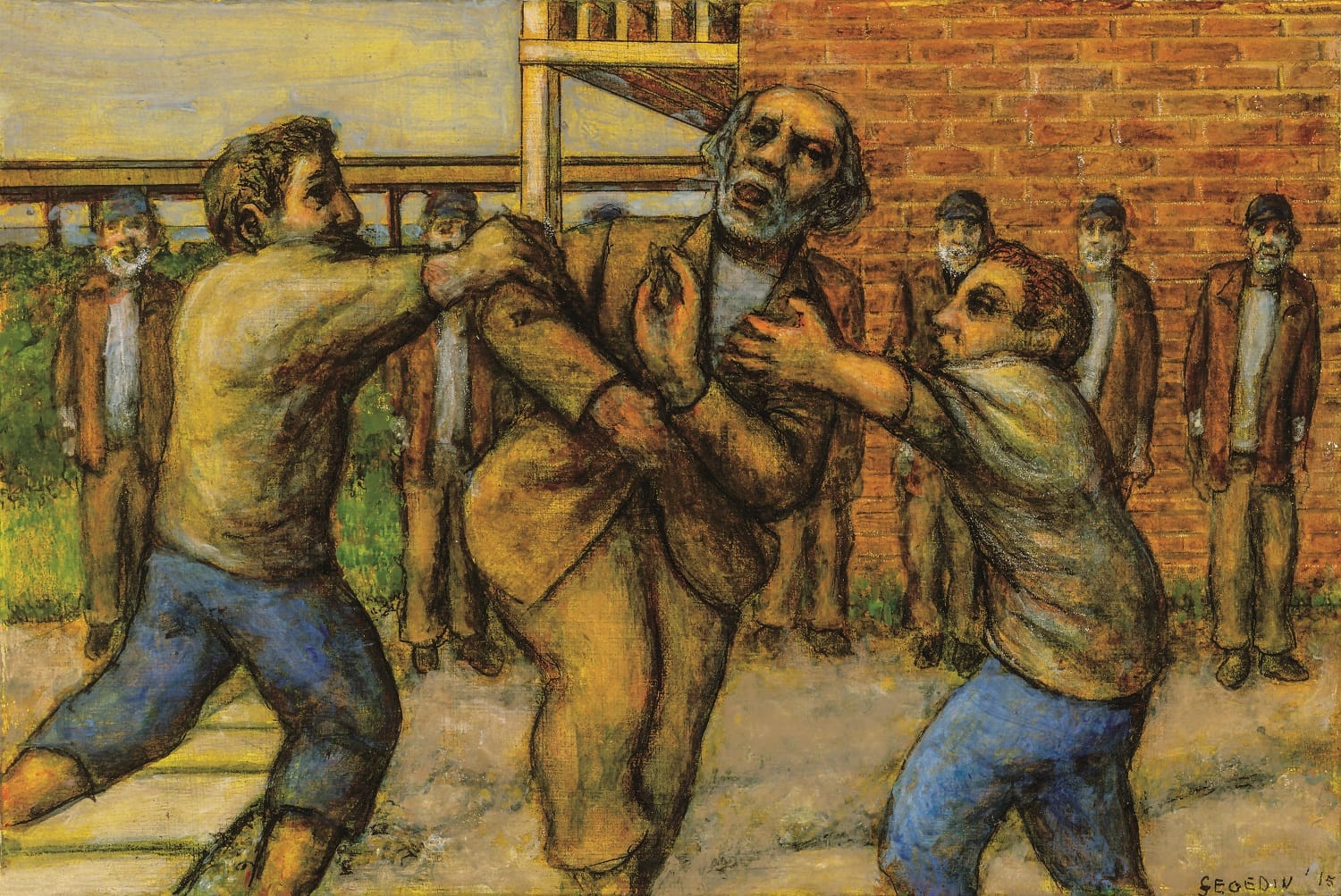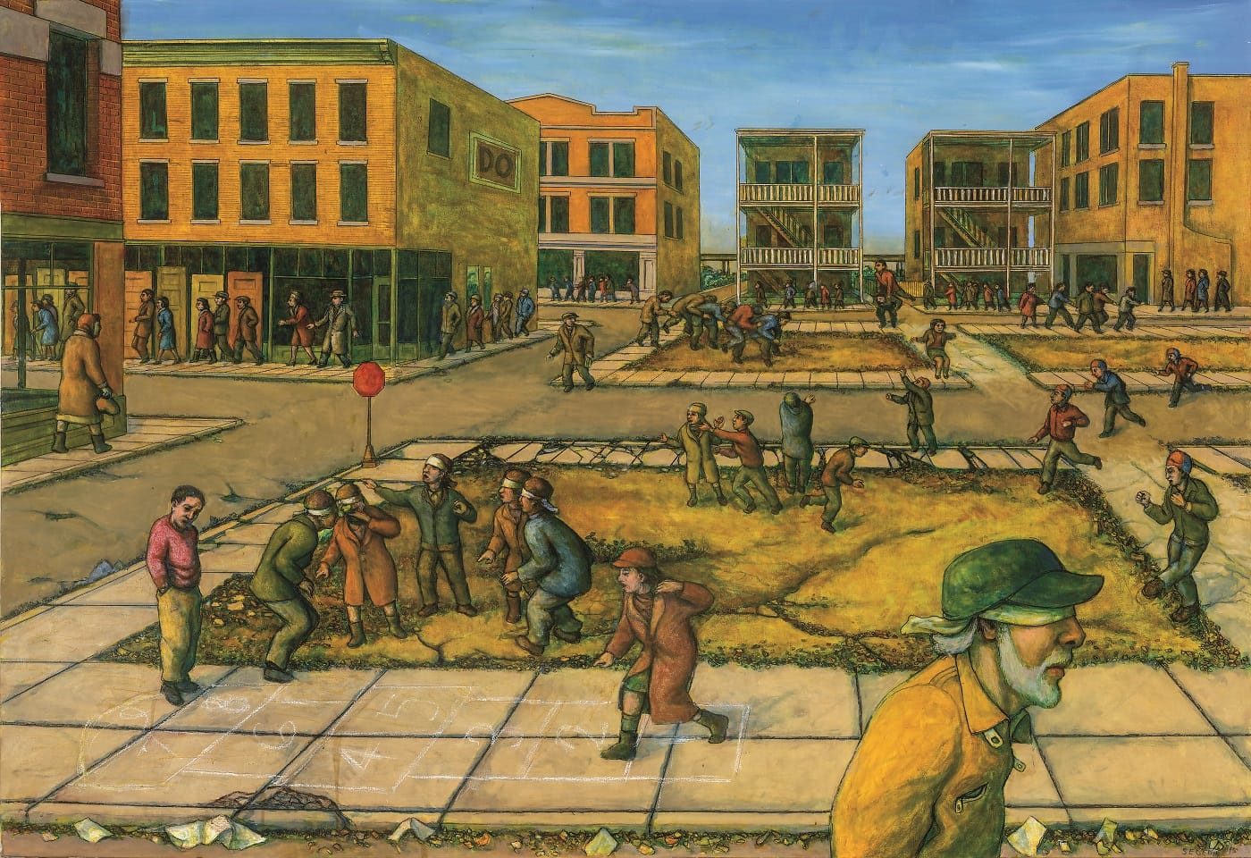“Games” (2015) depicts a gritty Chicago landscape, weeds breaking through the parched earth of a despoiled public square. Dozens of groups of people play various street games, many in blindfolds, including an aged Segedin about to stray out of the frame. As always, the games hint at violence, and the blindfolded figures betray an intense vulnerability.