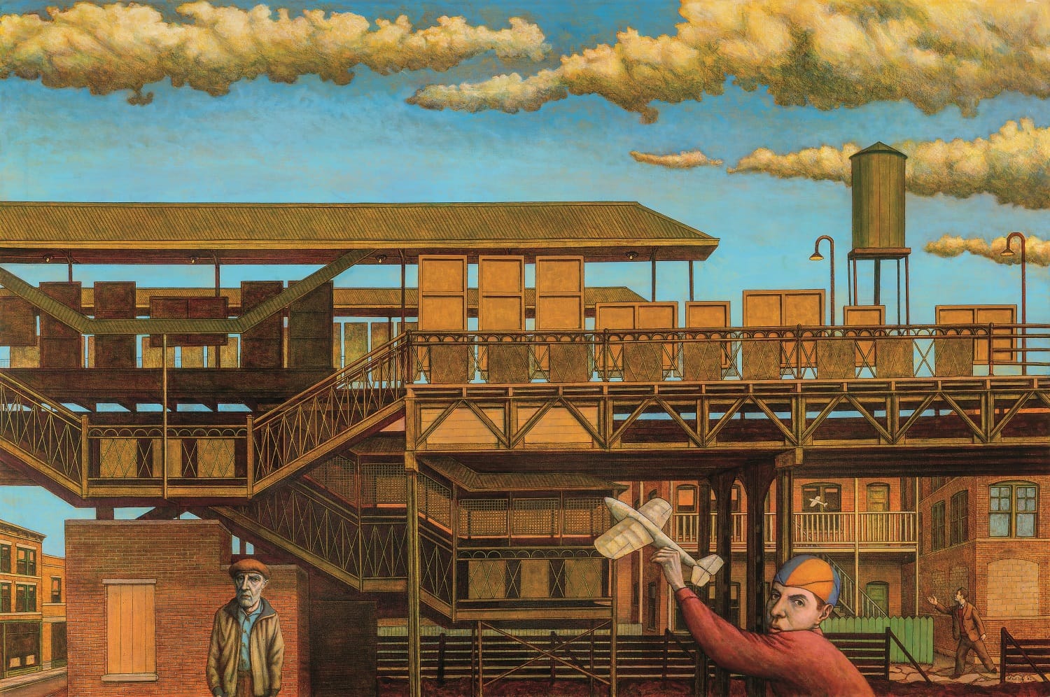 In the late 1980s, though, a new style emerged in Segedin’s work that seems aptly described as his “mature style,” not only because he has continued to work in this idiom, but because it coalesces all of the themes of his earlier work. These later paintings — often large in scale — bring together all of the elements that, separately, obsessed Segedin at earlier points in his career. Landscapes are no longer of Maine, but of Chicago’s open urban landscapes beneath the broad prairie sky. Violence that lurked in the form of the lounging boxers now appears in groups of people gathered in parks or at the el stop, striking poses that could be playful or animated, but project an unmistakable sense of underlying menace, suggesting that violence could break out at any time.