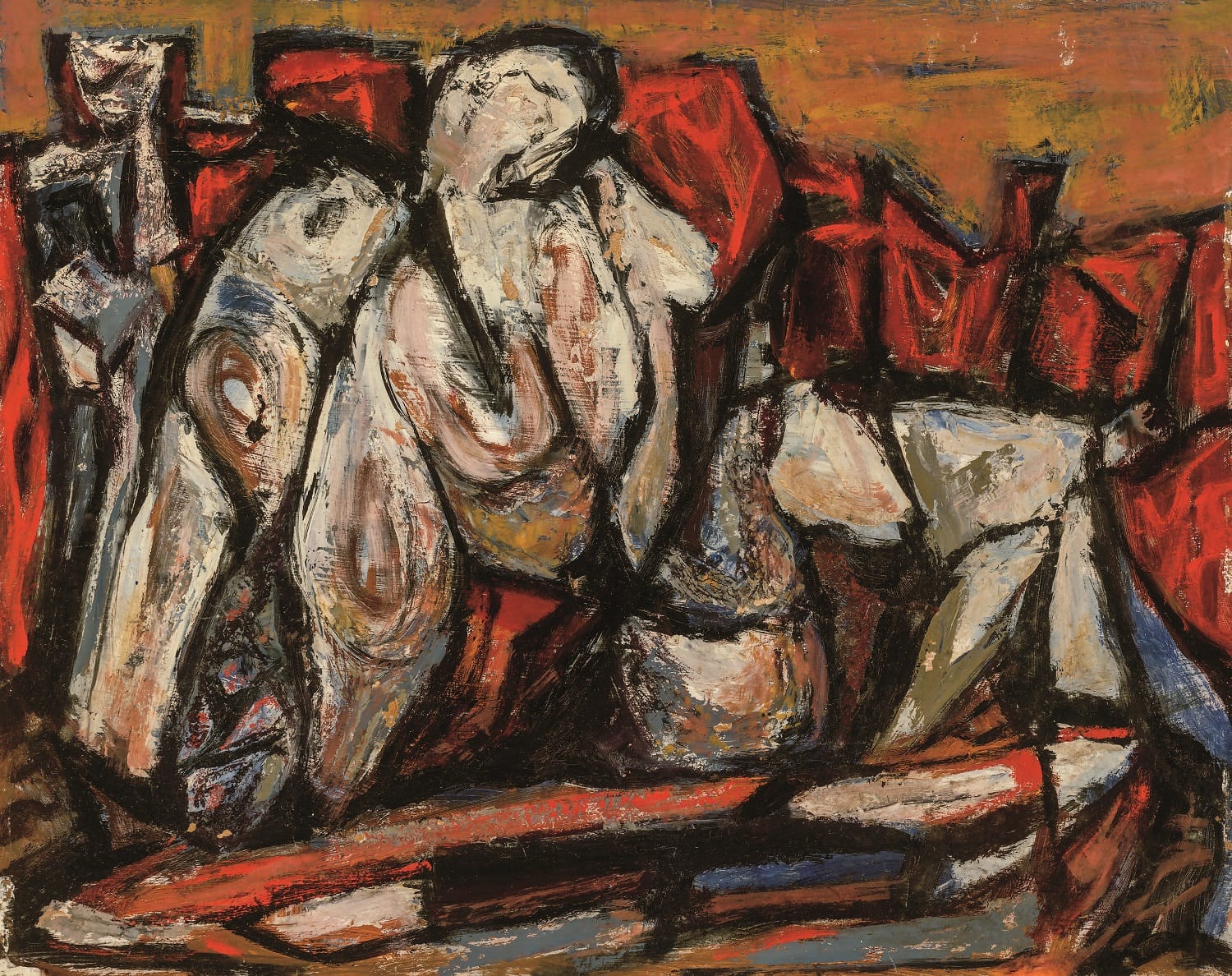 Perhaps the most haunting images from this section of the retrospective come from a series in which Segedin obliquely approaches the event that could not but dominate the imagination of a Jewish artist of his generation: the Holocaust, with its carefully administered, bureaucratically directed massacres. The ink drawing “Compartments I” (1976), for example, consists of three bands of imagery. In the topmost, several abstracted, mangled bodies rest atop two rows of compartments, each holding another pile of mangled flesh. In the lower left, yet another abused, pulverized body seems to rest on the floor, discarded.