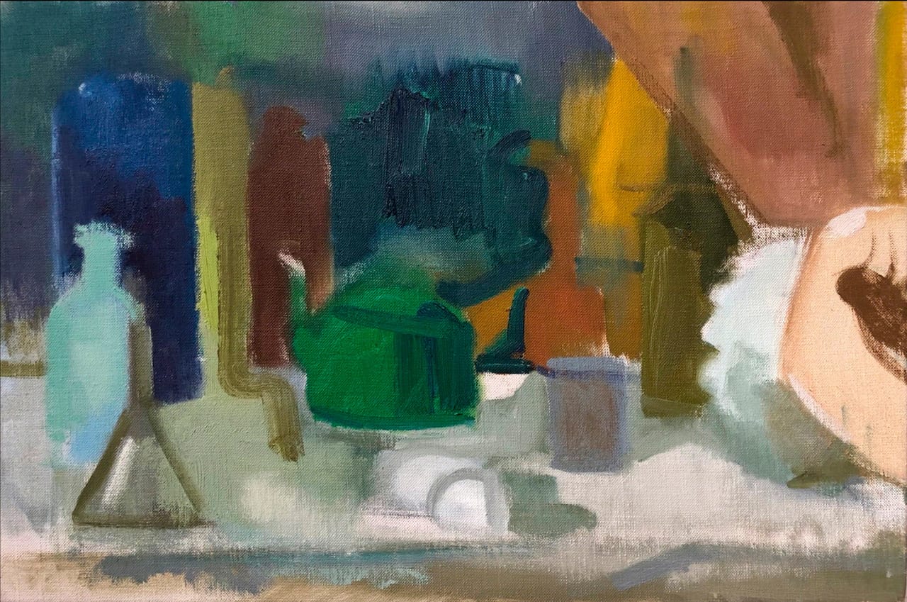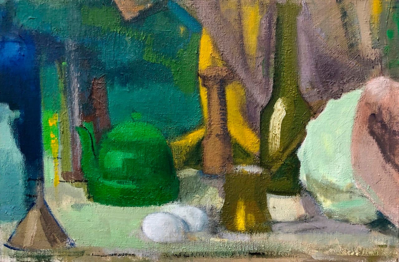 In other recent paintings, Cézanne’s embrace seems to slip away to something more elemental — to the forces that perhaps influenced the French master in the first place. Miller’s hues respond as much to changes of light as to the objects themselves, their contours beginning to dissolve; color alone weights them in place. In the more conspicuously abstract “Shell and Green Tea Pot Still Life” (2018), the notes of bottle, funnel, eggs, and teapot pace the breadth of a tabletop, itself turned a half-dozen blue- and green-grays by the vagaries of light.