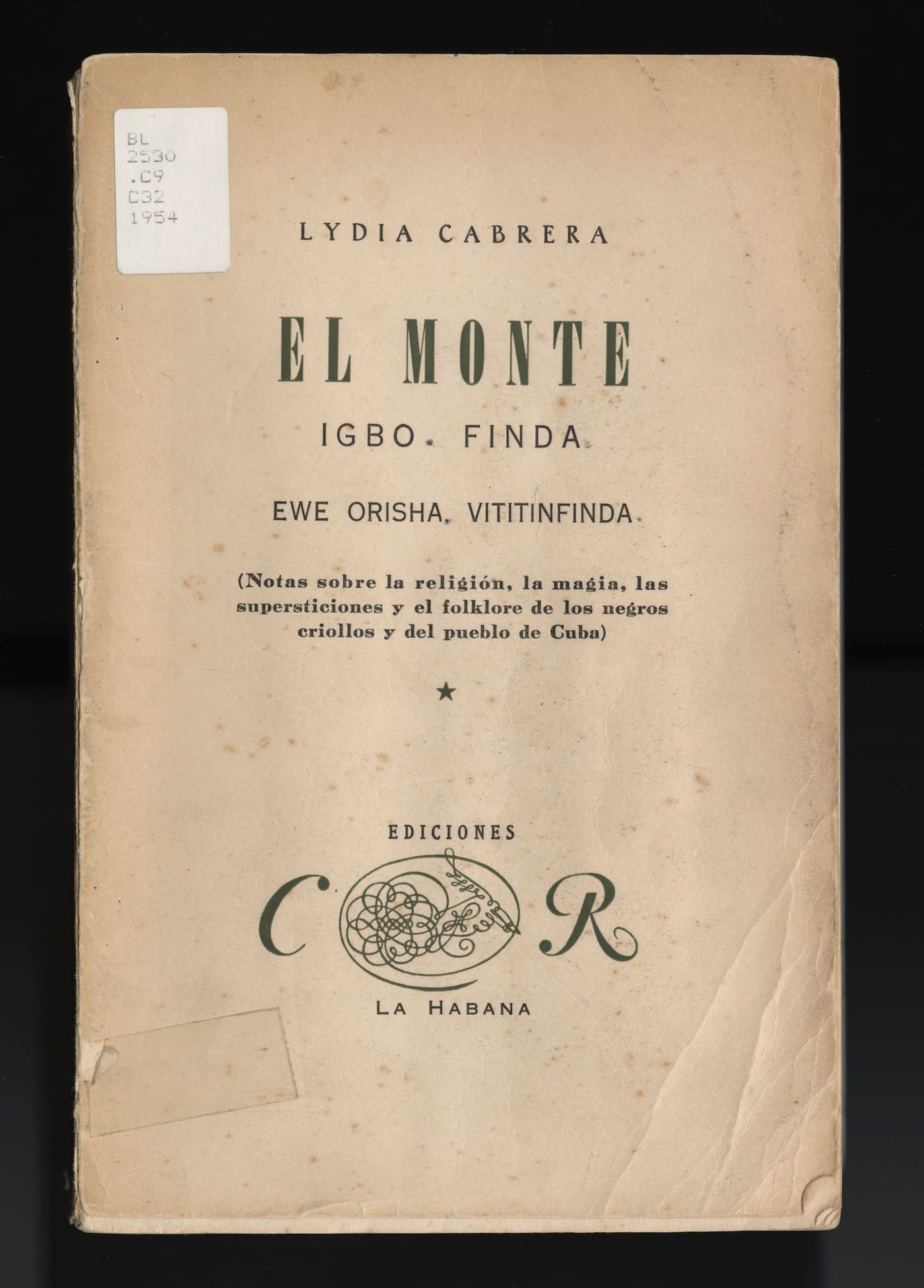Lydia Cabrera, “El monte, igbo finda, ewe orisha, vititinfinda; notas sobre las religiones, la magia, las supersticiones y el folklore de los negros criollos y del pueblo de Cuba” (La Habana: Ediciones C.R., 1954), first edition, 9.3 x 6.1 inches, Cuban Heritage Collection, University of Miami Libraries, Coral Gables, Florida