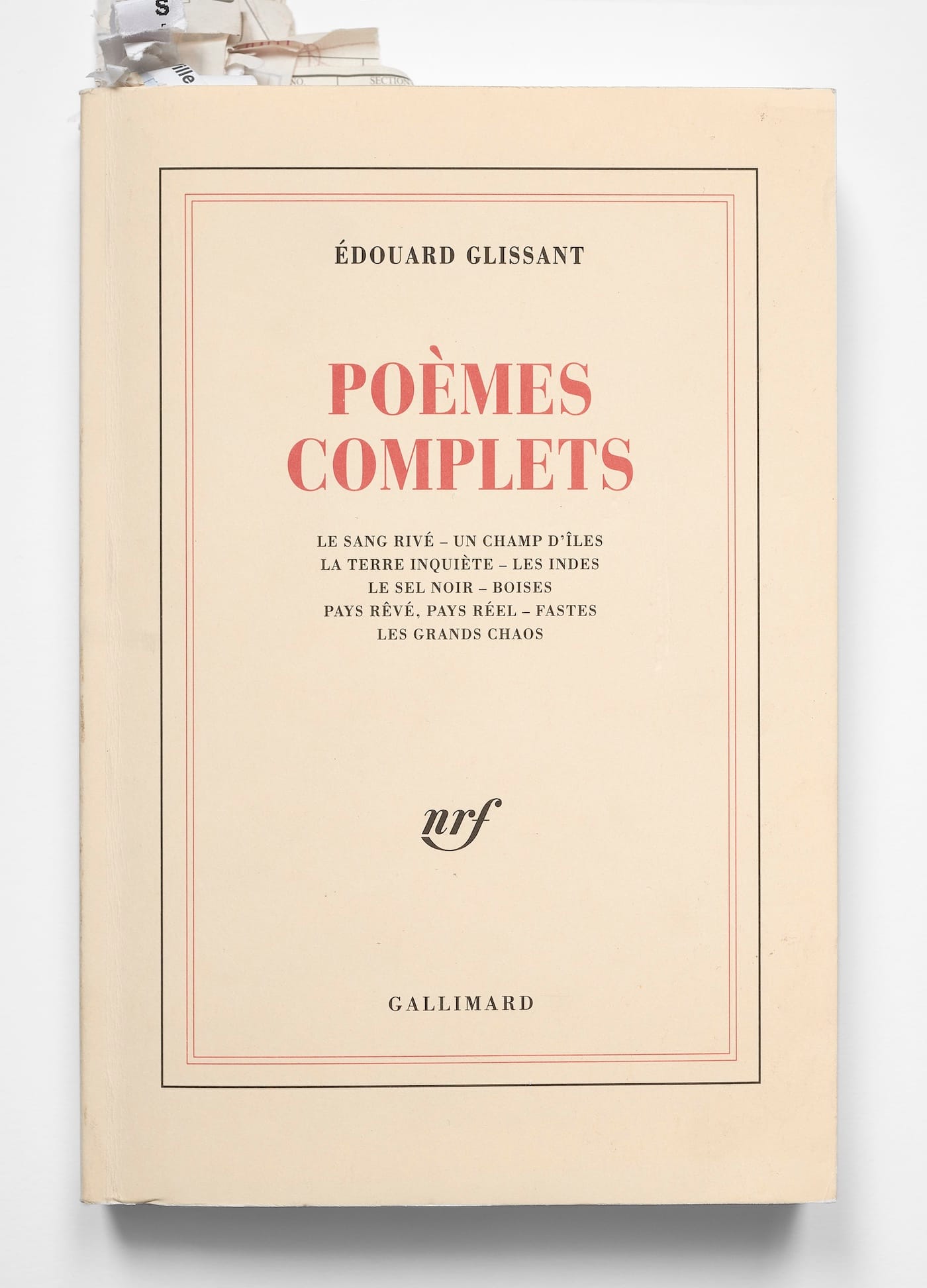 The exhibition contains Flamariouss (2006), a book collaboration between the Korean artist Koo Jeong A and Glissant, Hommage a Édouard Glissant (2014), an accordion book of colored brushstrokes by Etal Adnan; and a set of 12 small works done in acrylic and sumi ink on rice paper by Jack Whitten for his painting, “Atopolis: For Édouard Glissant” (2014).