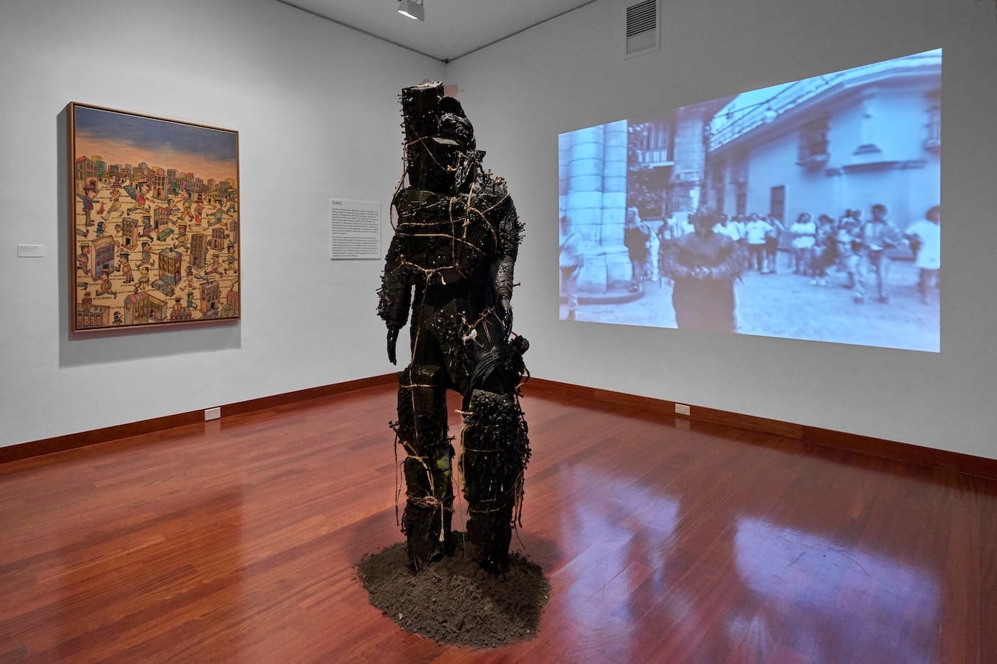 There are names that will likely be new to the visitor, including Amelia Pelåez, who traveled to France with Cabrera in 1927 to study painting. Her “Mujer con pez (Woman with Fish)” (1948) is a knockout. Another highlight is Tania Bruegera’s figurative sculpture, “Displacement” (1998/2005), which is made from Cuban earth, glue, wood, nails, and textile. A video projected onto the wall documents the sculpture as a costume being worn at a public street performance in Cuba.