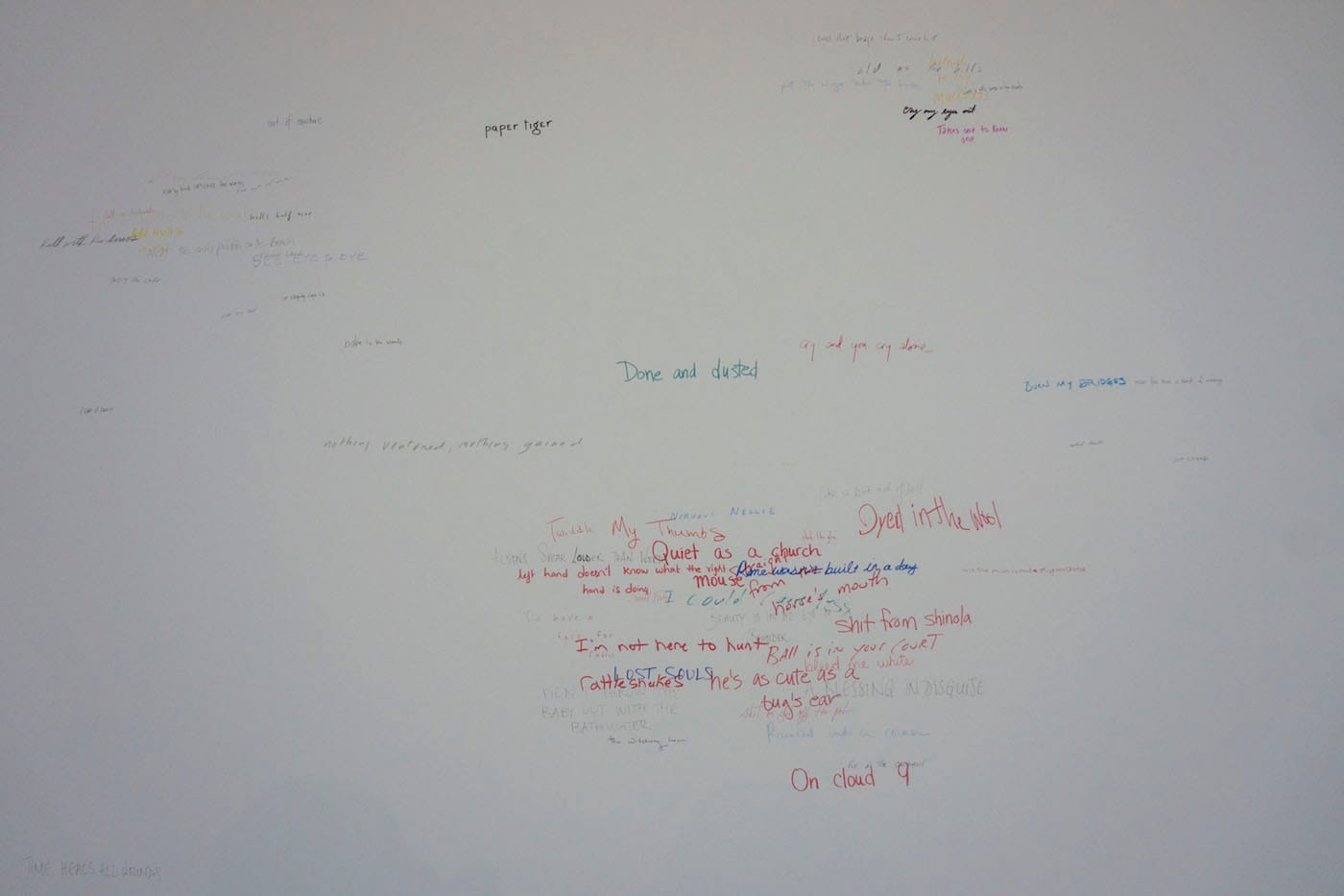 Back in the Living Room, a billowing, untitled Ruth Asawa from 1956 hangs in a pyramidal alcove. Hundreds of idioms — absurd out of context — are irreverently scrawled in pencil and bright marker across the wall in Roni Horn’s “Wits’ End Sampler” (2018). “Done and dusted”; “Shit hits the fan”; “BESIDE MYSELF” — the drawing defeats the clean lines of the Living Room, reminding me of scribbling frenetic thoughts in a notebook, just to get them down. Horn will have a two-part exhibition, curated by Michelle White, opening at the MDI next February.