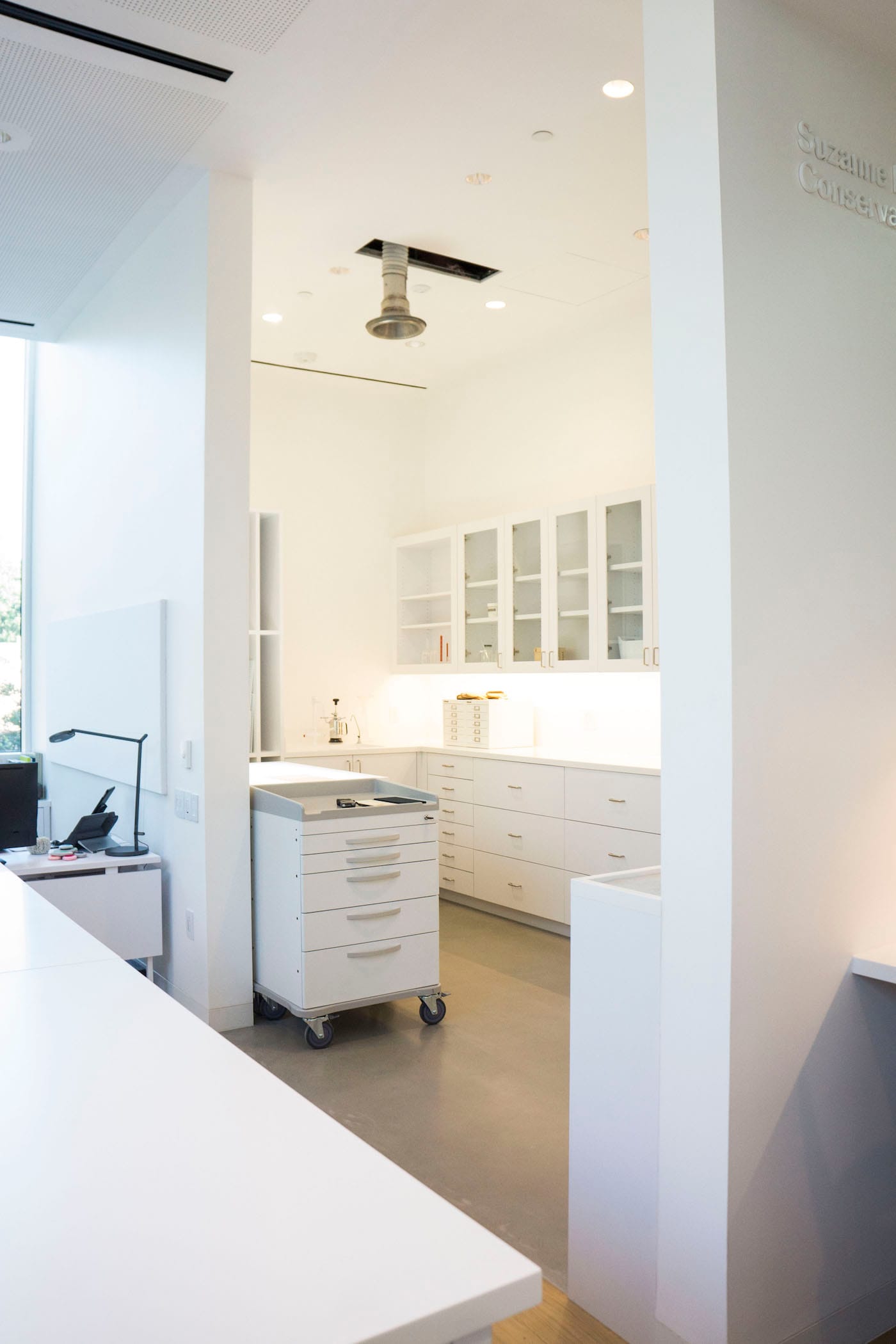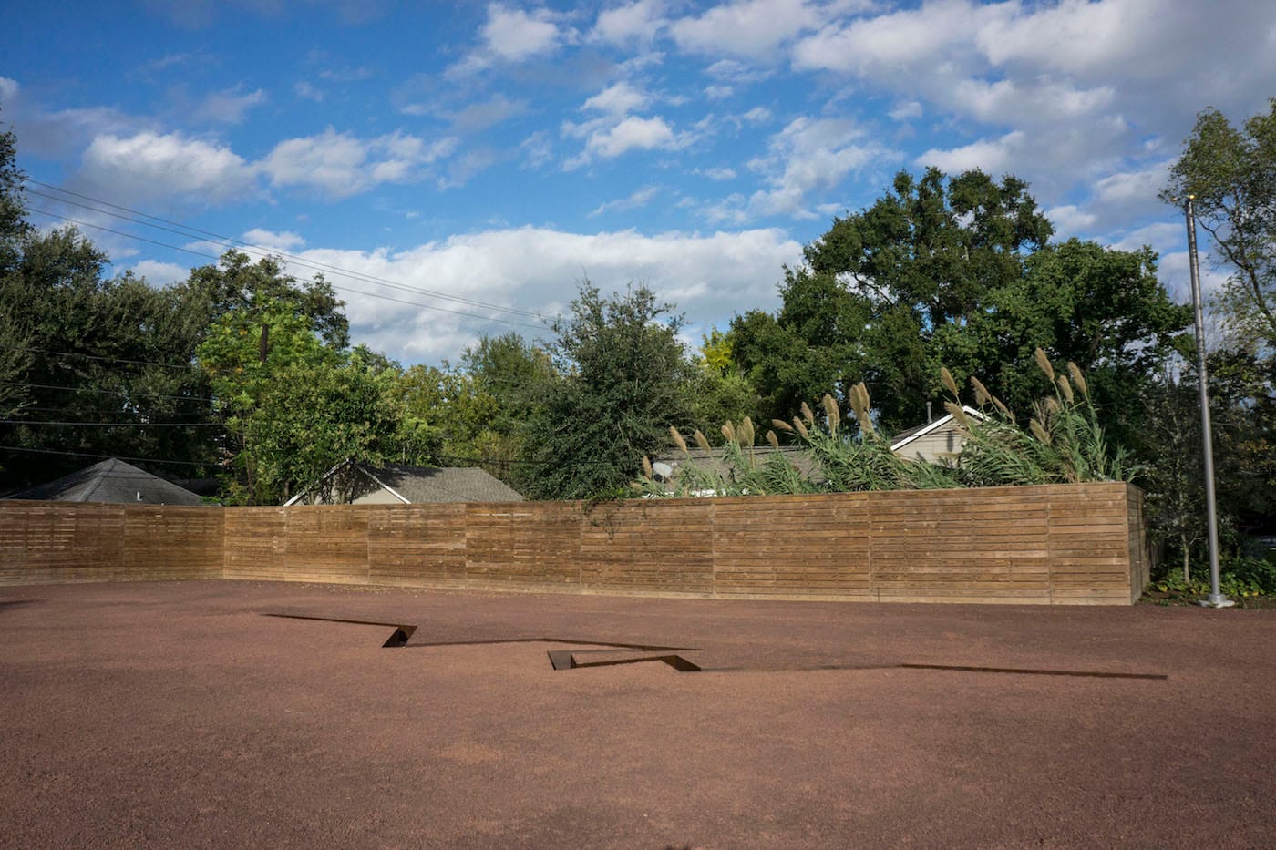 In designing the new building, Johnston Marklee and the Menil Collection made a conscious decision to not make another ambiguous white cube (seen in so many museum expansions today). The architecture reflects what happens when you ask your clients — the curators, registrars, preparators, conservators, and staff in the building every day — what they need. Two fellows’ offices face the scholar courtyard — nice that they’re not in a corner or the basement — and mark the entrance to the Drawing Room and Study, where frosted skylights are folded over a pitched roof. The Conservation Center windows look out over two striking calligraphic Michael Heizer drawings in weathered steel, which have been relocated from the Main Building’s front lawn. Cut into a tomato-red Argillite gravel, the drawings are as close to the real thing in the Nevada desert as you can get.