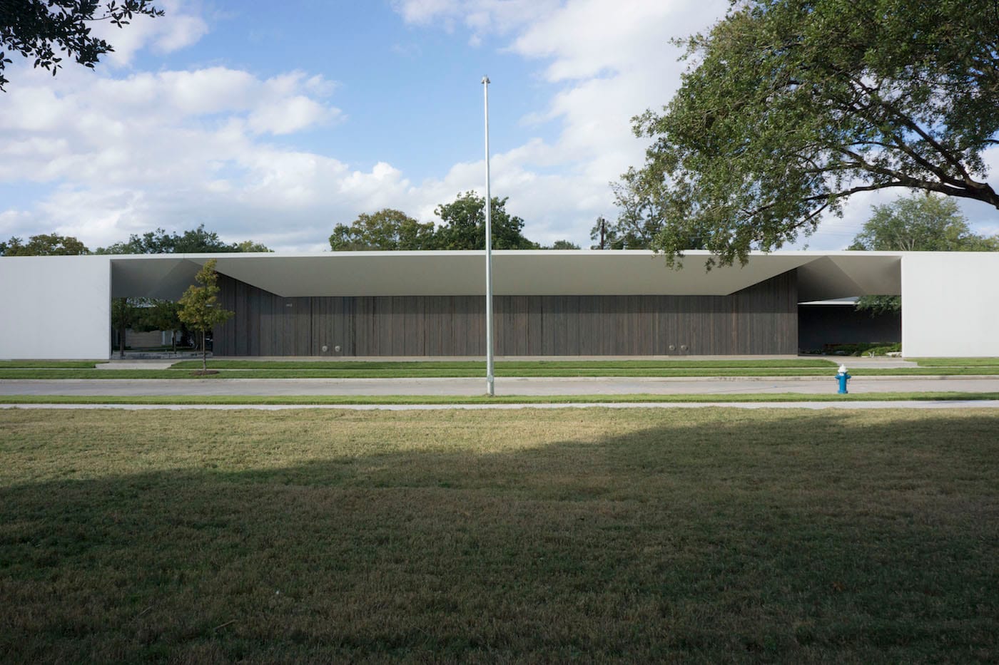 HOUSTON — After six years in the making and $40 million in investment, the Menil Drawing Institute (MDI) building opened this past weekend. Designed by Johnston Marklee and Michael Van Valkenburgh Associates, the 30,000-square-foot structure has a certain lightness about it. Composed of cool white steel plates, glass, and stained Port Orford cedar, the building is low-slung and pressed lightly into the blue Houston sky — its façade barely there at some points, save for a tree or two casting its shadow and tracing a presence on the surface. Structural steel grids within the building’s plates rib out and give a gentle rhythm to the façade, and Ellsworth Kelly’s elegant, ivory-white “Menil Curve” (2015) — his last public sculpture — sits at the entrance, lightly reflective and bowing into line as one walks by.