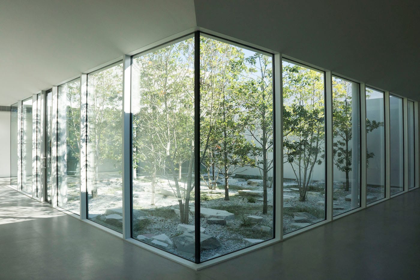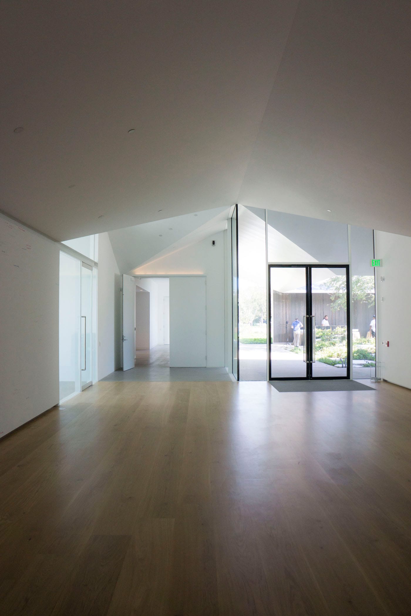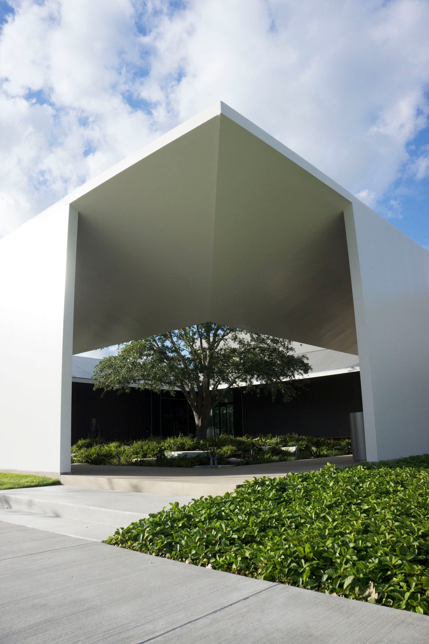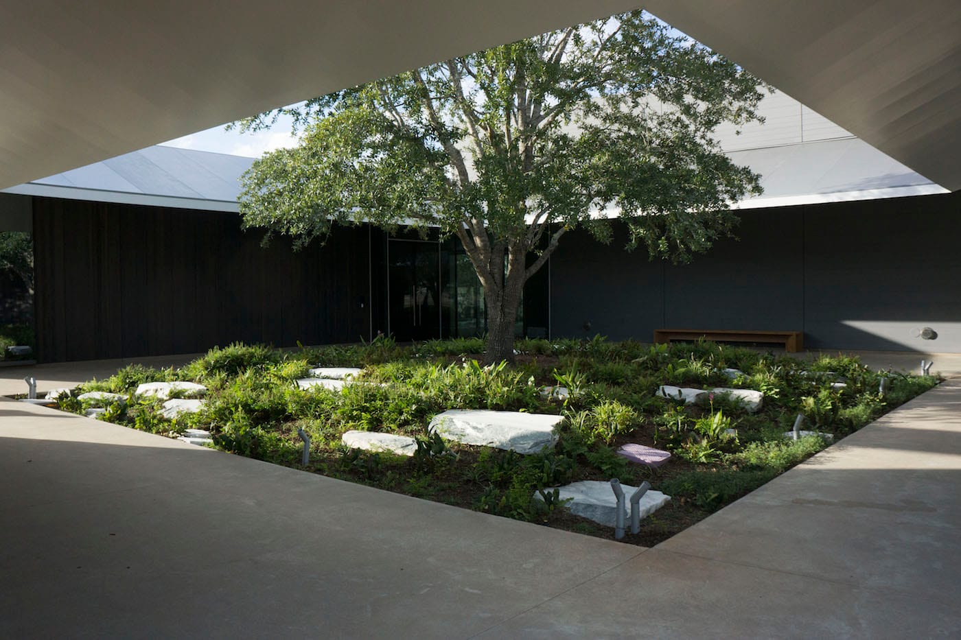 Located at the center of the Menil Collection’s 30-acre campus, south of the Main Building and across from the Cy Twombly Gallery, the MDI seems to meld into greenery; a grand, live oak frames the structure, and three square gardens are directly incorporated into the building. One highlight is the courtyard for staff and visiting scholars, tucked inside the building and punctuated with a grove of streaked marble and young Japanese magnolias that filter dappled light into the corridors. During opening weekend, the trees poked through and whistled in the wind, but in a clime as unpredictable as Houston (where there was torrential downpour and a tornado warning just one day before I arrived), I imagine rain running down the roof in a shimmering curtain of water would be equally stunning. It’s this attention to detail that allows visitors to always be aware of light and space while in the MDI — whether it be a cloud passing over a skylight, or shafts of raking light warming up the building.