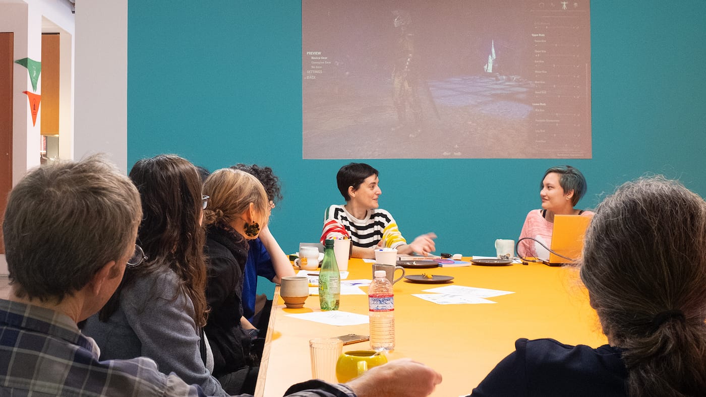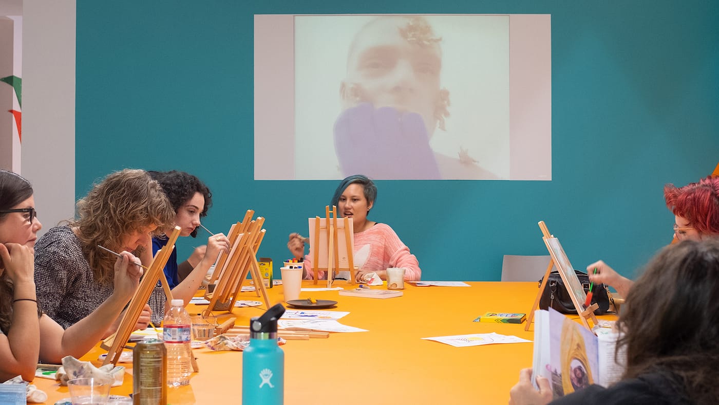 Dao, who was wearing a pink sweater with a picture of a white rabbit (a rabbit is her avatar when playing games online), was teaching a class on “Anatomy and Nudes” as part of the exhibition The Feminist School of Painting at the nonprofit art organization KADIST in San Francisco. The school has a small library and murals on the walls in pink, turquoise, and brown. The large table had papers with anime scenes and crayons to color them in with. On seven Saturday afternoons in October and November, the school, a project of Argentinian, Buenos Aires-based artist Ad Minoliti, has offered free classes in traditional subjects including still life, portraiture, and landscapes. But the approach is not traditional. In this class, for example, Minoliti and Dao wanted to challenge traditional ideals of beauty by emphasizing different types of bodies, as well as creating identities through collage and avatars.