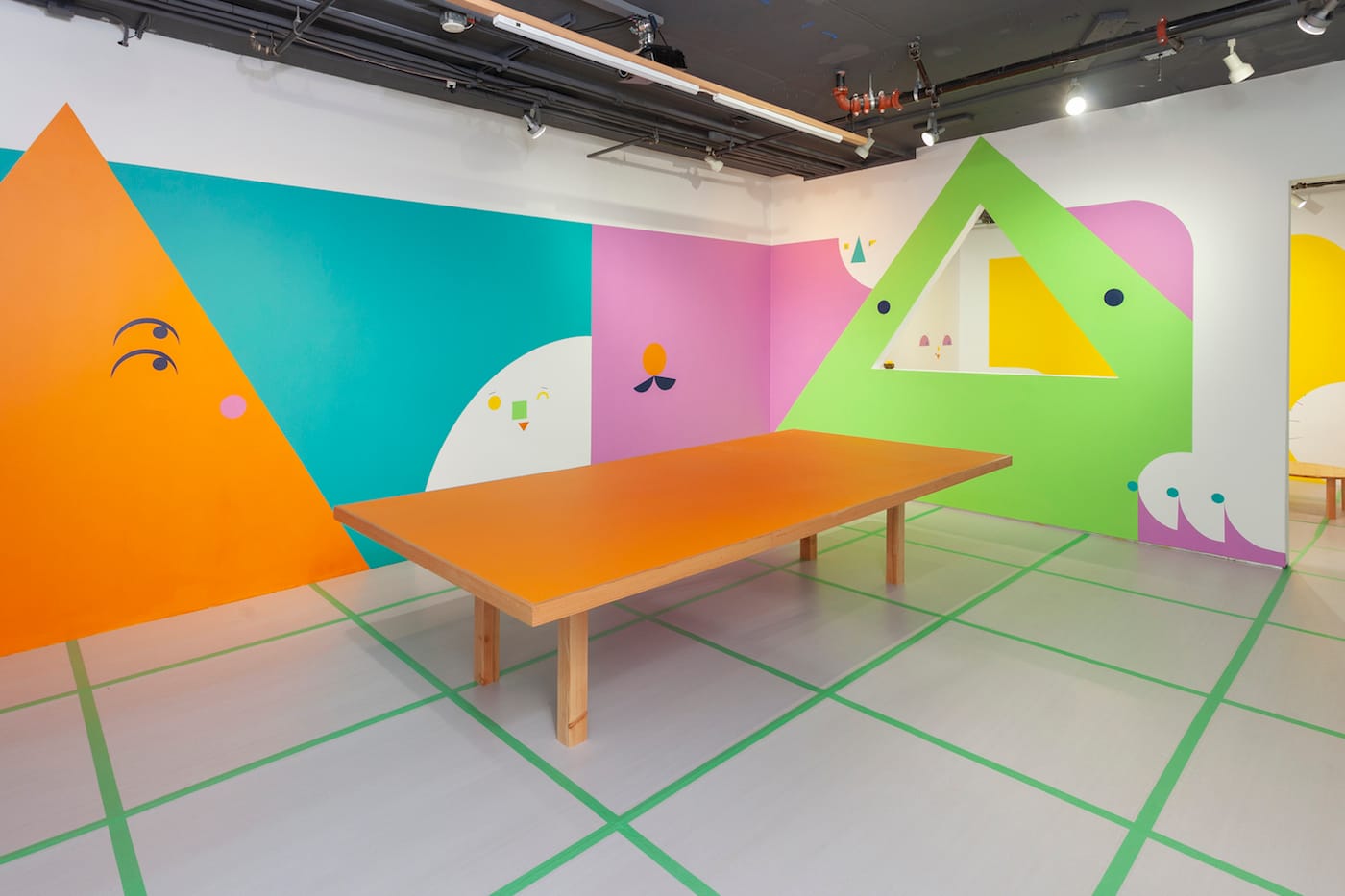 Minoliti sees The Feminist School of Painting as a space for artists and non-artists alike. With the big tables and crayons, they wanted to create an atmosphere of a kindergarten and to welcome all ages. For them, the whole project is an experiment.