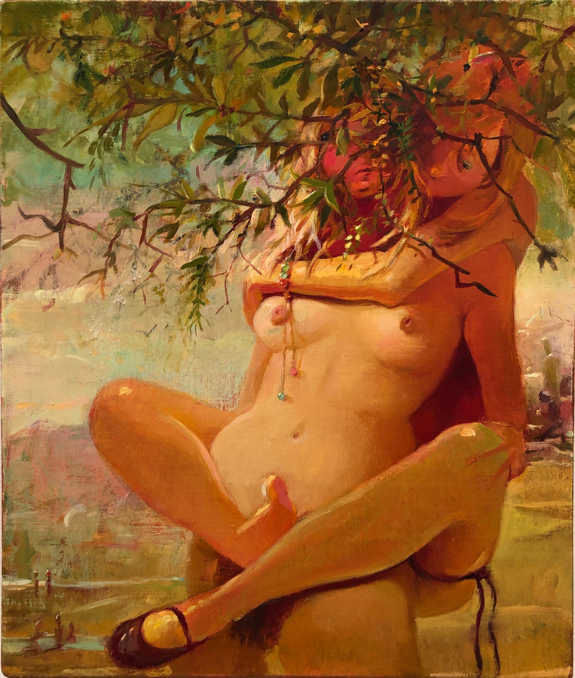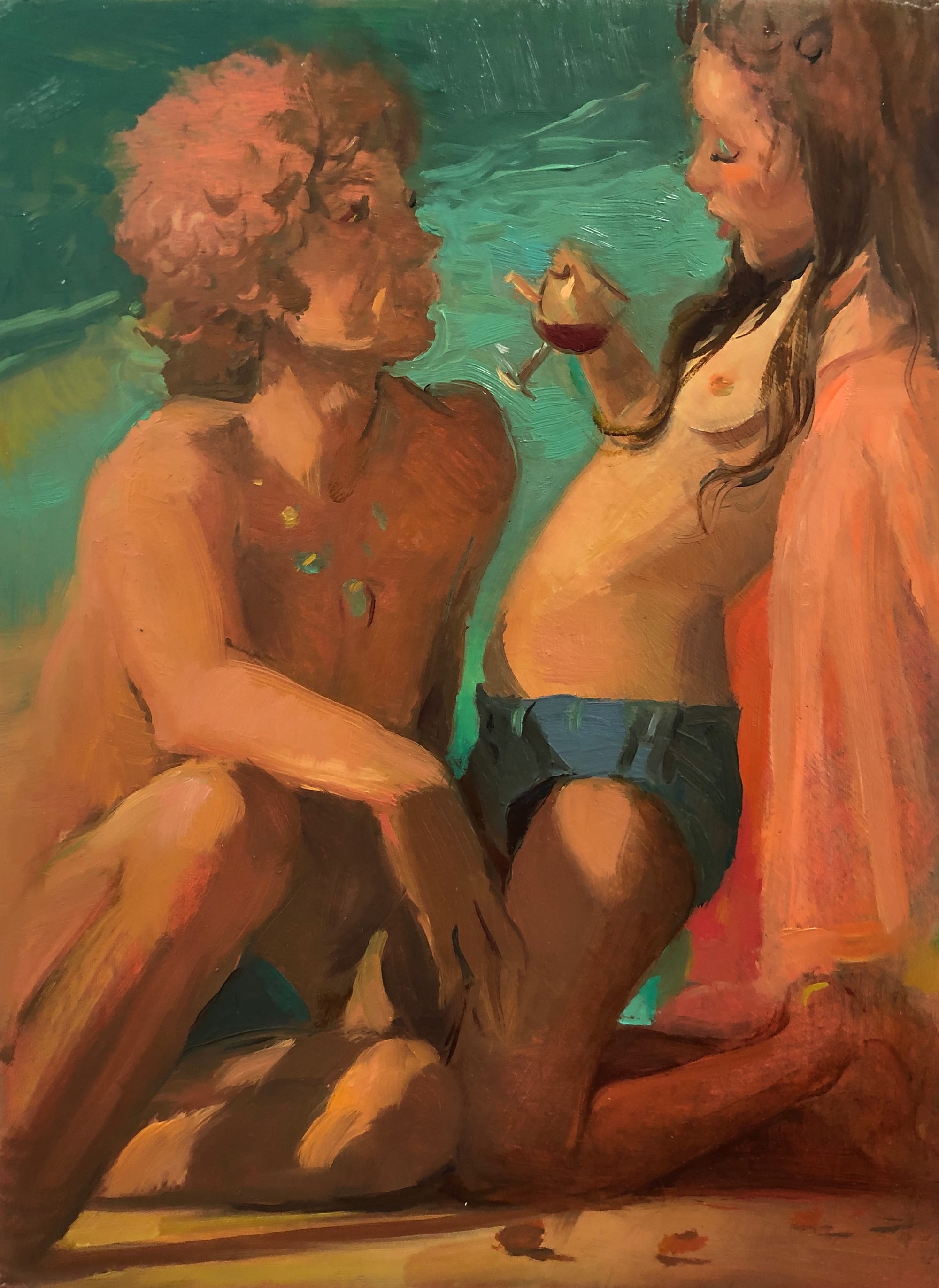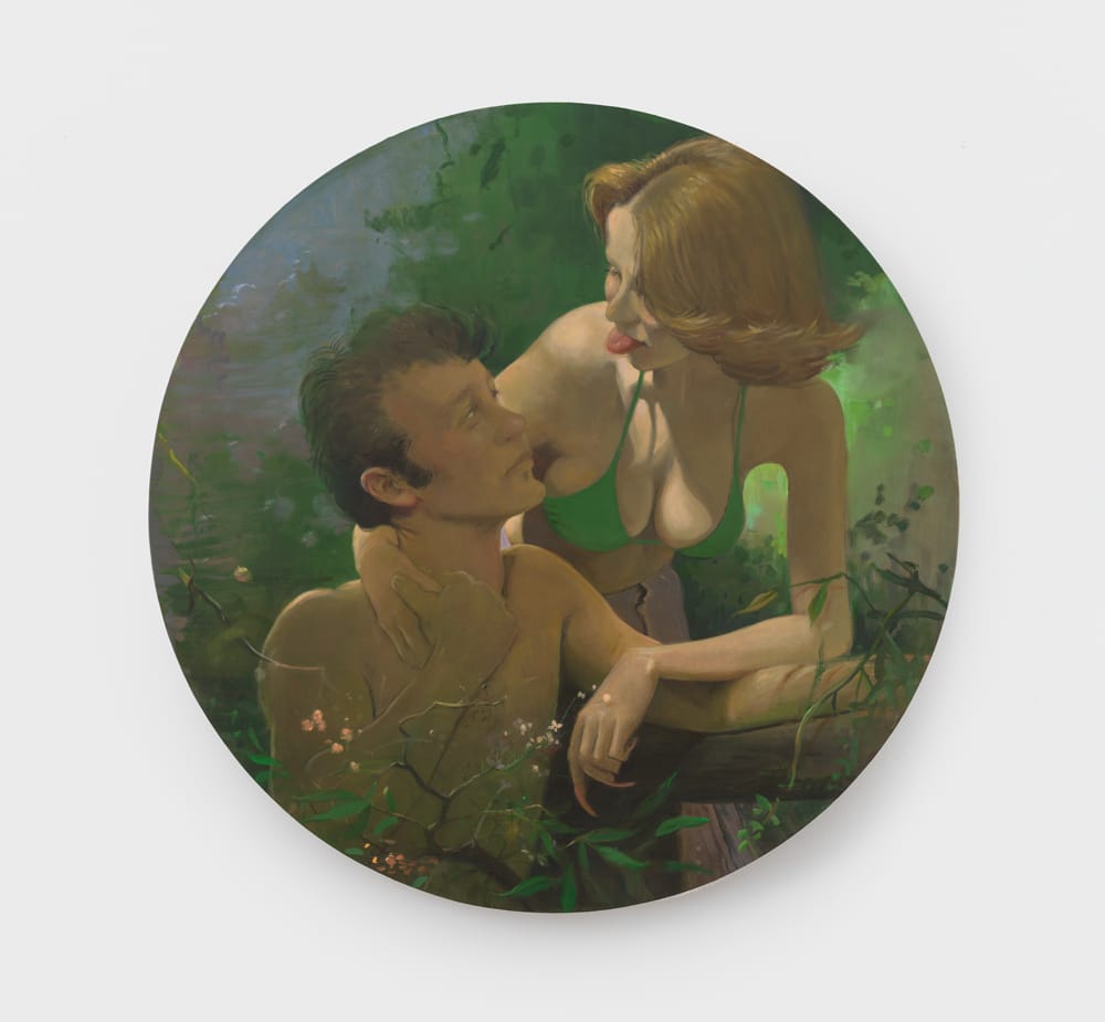 In addition, the backlighting reveals that the young woman is now holding a small white rectangle behind her back, pursed between thumb and index finger. Is it paper? A concert ticket? Perhaps a letter like the one held by the maid in Vermeer’s “Mistress and Maid”? Her arched posture signifies not just revealing, but also hiding and withholding. “Golden Couple” thus becomes a painting about teasing, an attitude also evident in “Tongue Tondo,” (2018) in which a woman sticks out her tongue at the man she is caressing while they kneel in a swamp.