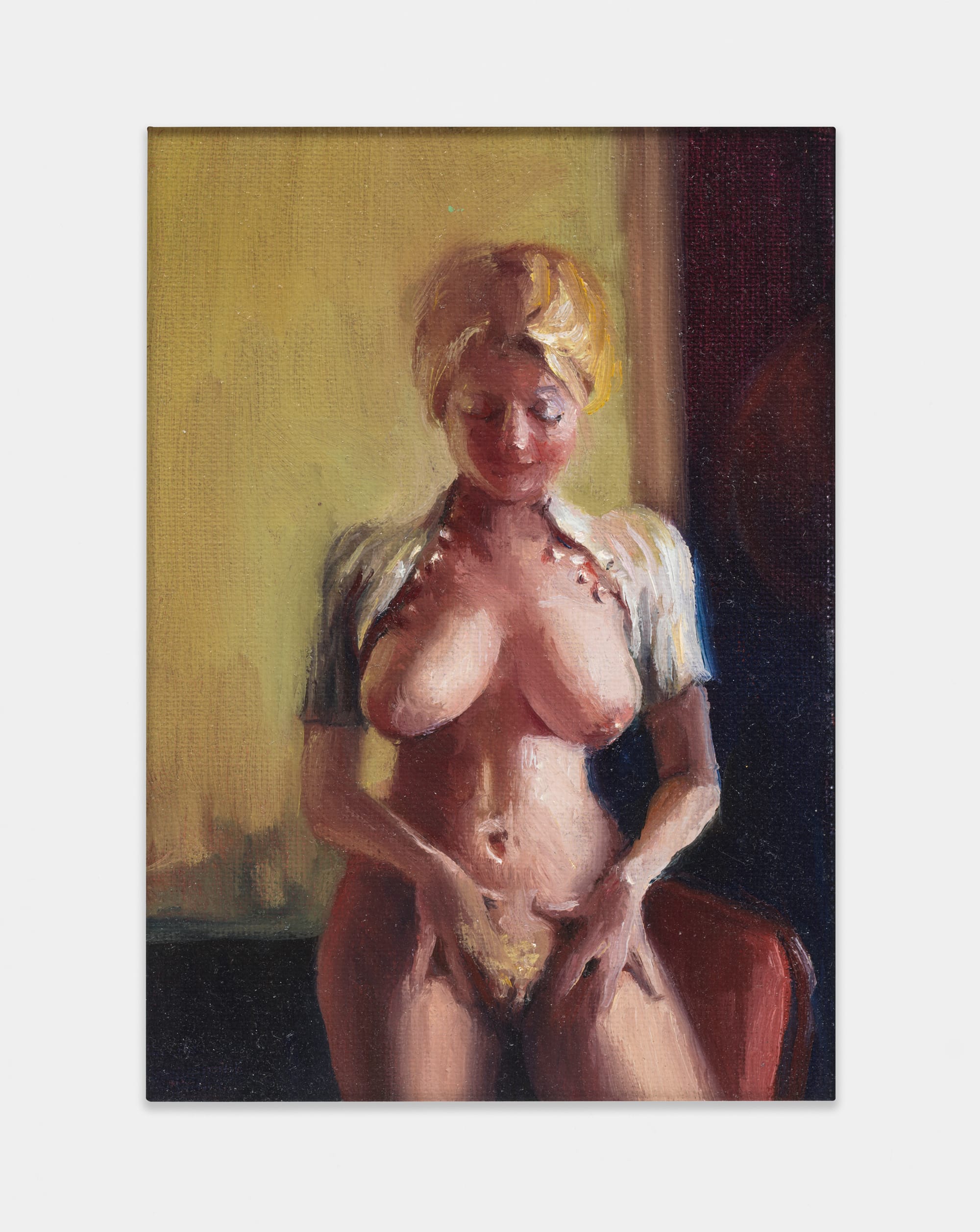 Babie Brood allows us to trace the development of several of the new large paintings from the small studies — for example, “Golden Couple,” in the uptown show, and “Phil and Eileen,” and “Phillip and Irene” downtown (all 2018). All three paintings feature a blond, frizzy-haired, mustachioed and bare-chested man, bedecked in love beads, and a woman with long, straight blond hair and denim shorts loosely fitted over her thin pelvis. He is half-crouched with right forearm resting on knee and gazing appreciatively at his partner, while she thrusts her taut belly forward and kneels next to him in a favorite Yuskavage pose (reminiscent of the posture in “Sweetpuss”), her rounded back exposing her small, bare breasts.