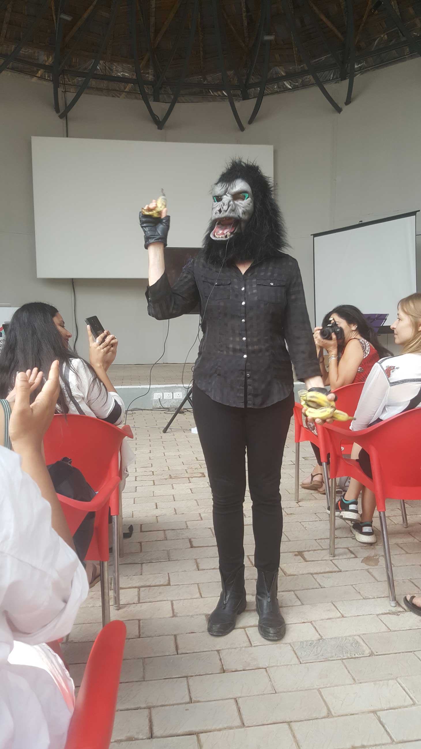 A thunderous applause followed, as many audience members stood in solidarity. The Guerrilla Girls replied by asking D’Mello to send them more information so that they can get a better read on the events and act accordingly. After several other questions, the moderator of the event handed the microphone over to curator of the Kochi-Muziris Biennale, Anita Dube, for the final word.