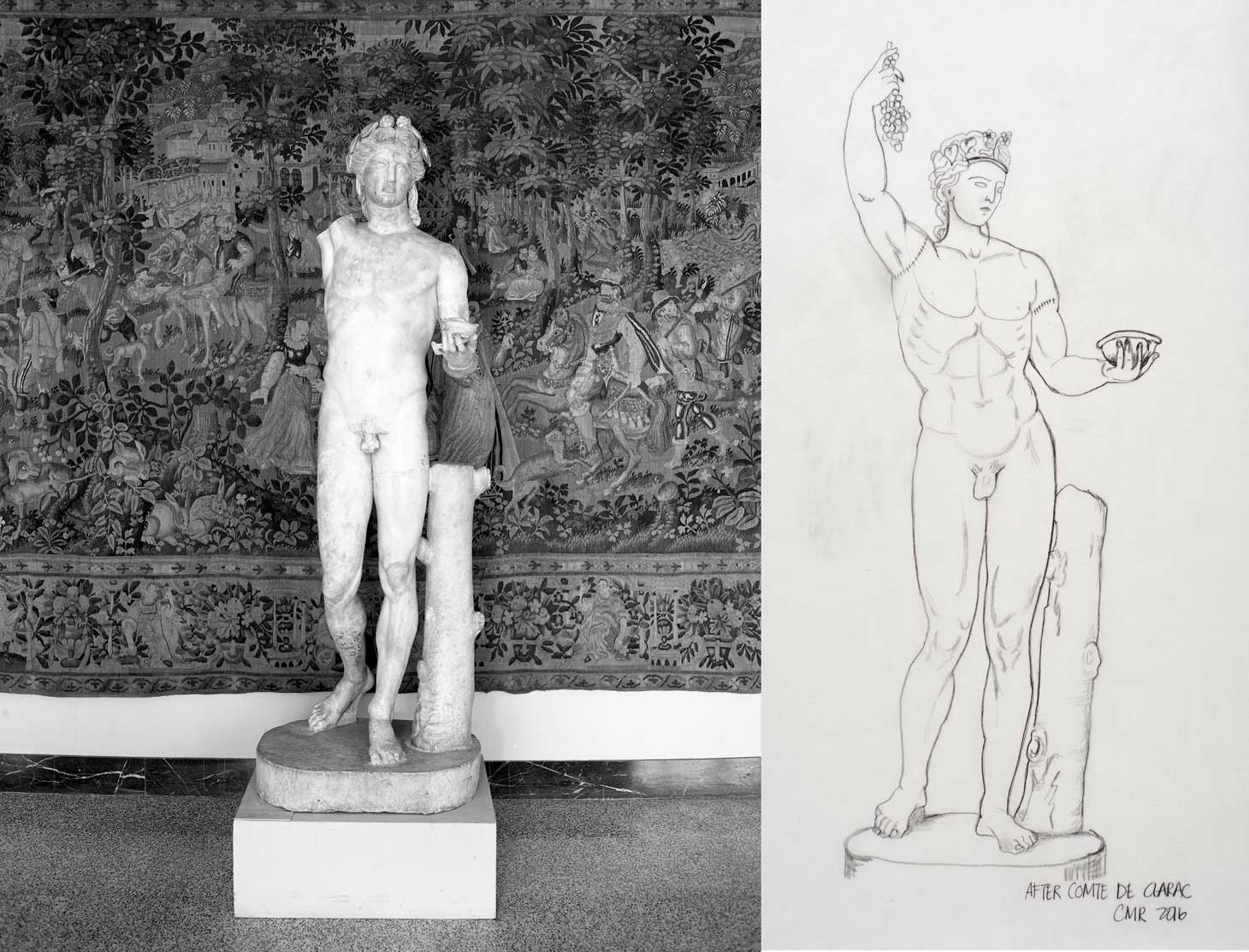 Walker is participating in the museum’s ongoing Bacchus Conservation Project, which is currently working to amend the statue’s headless state and missing right arm. Working from an 1837 drawing of the completed statue, Walker posed for the 3D scan holding a bunch of grapes aloft in his right arm.