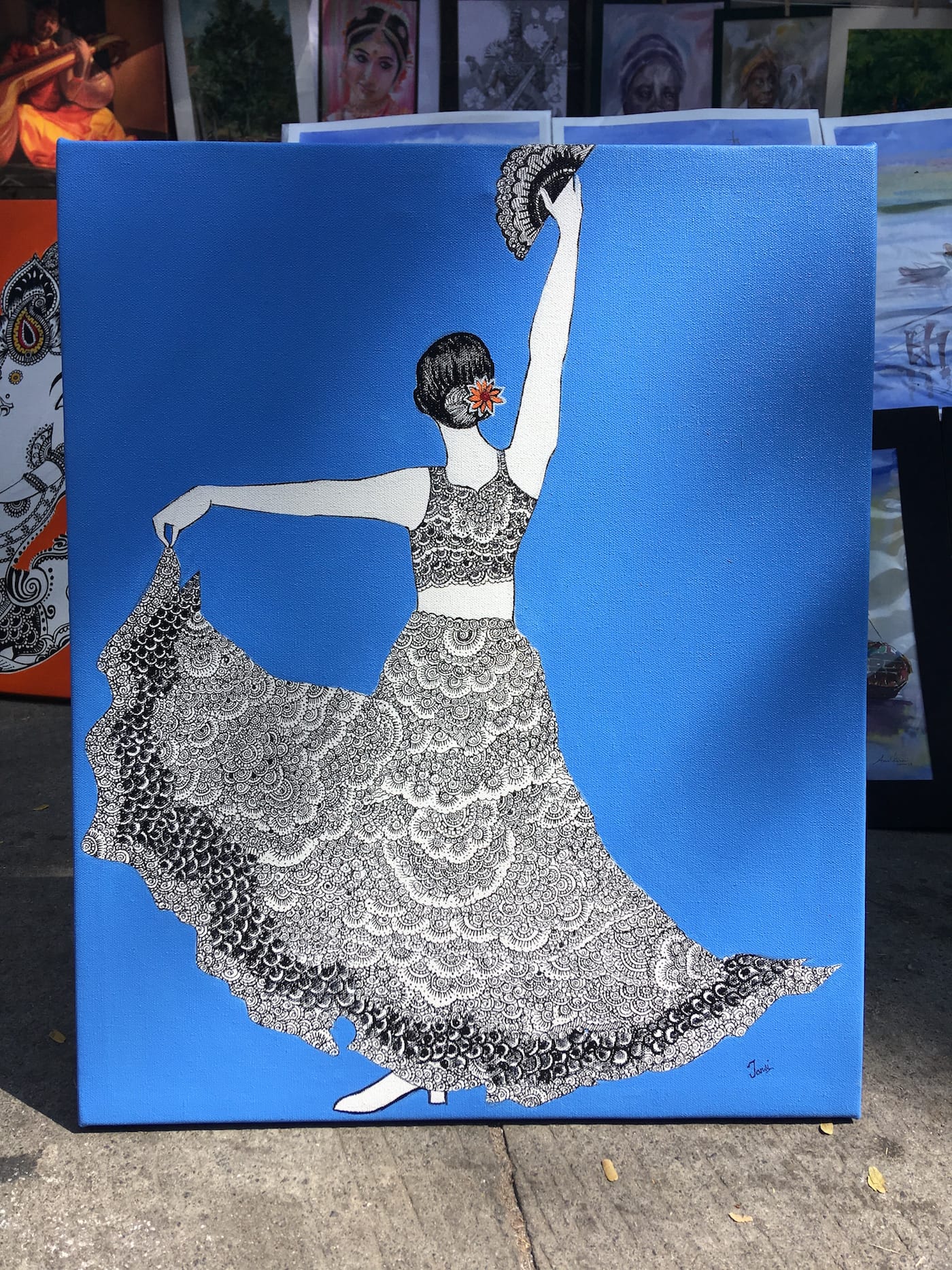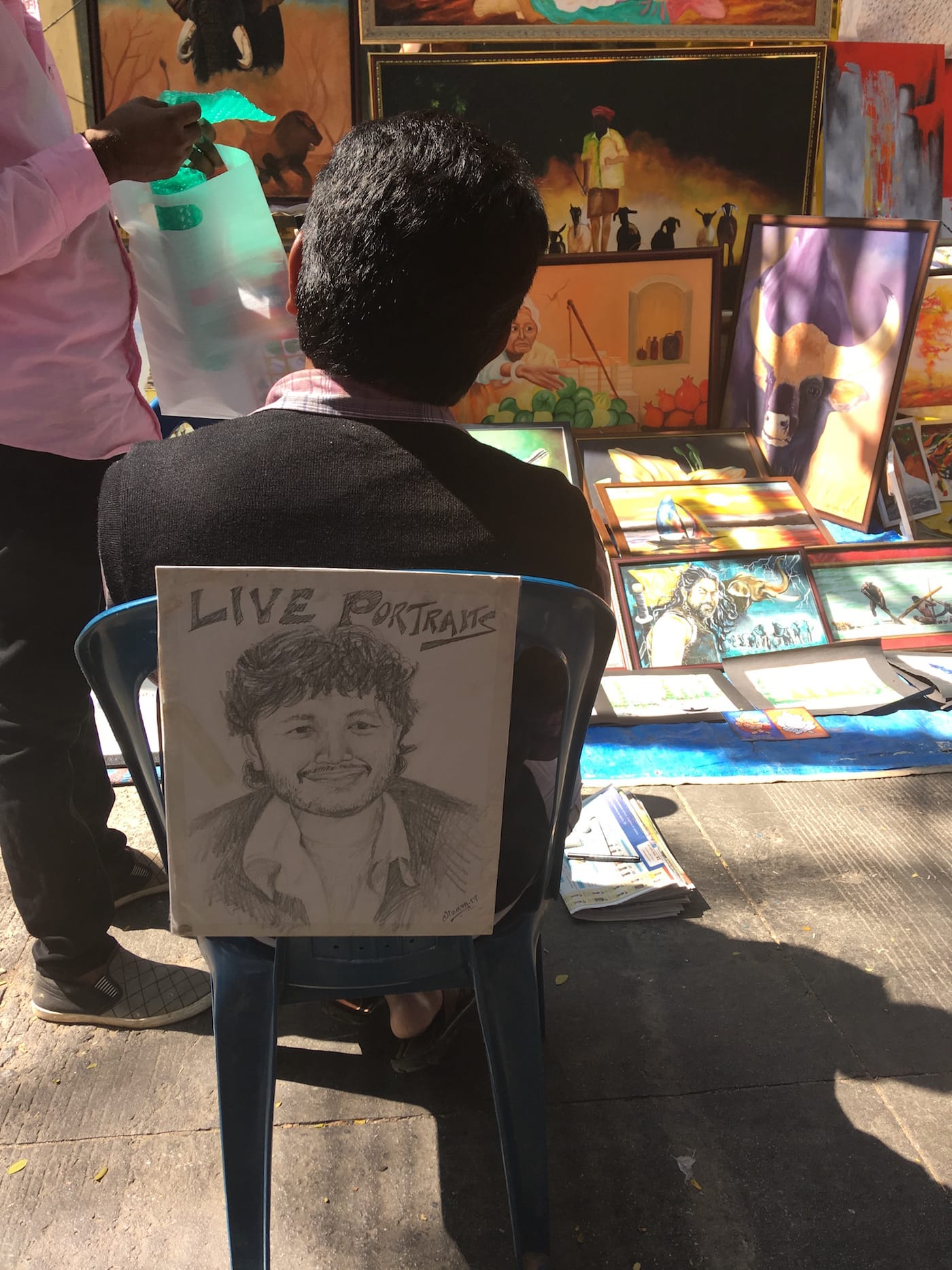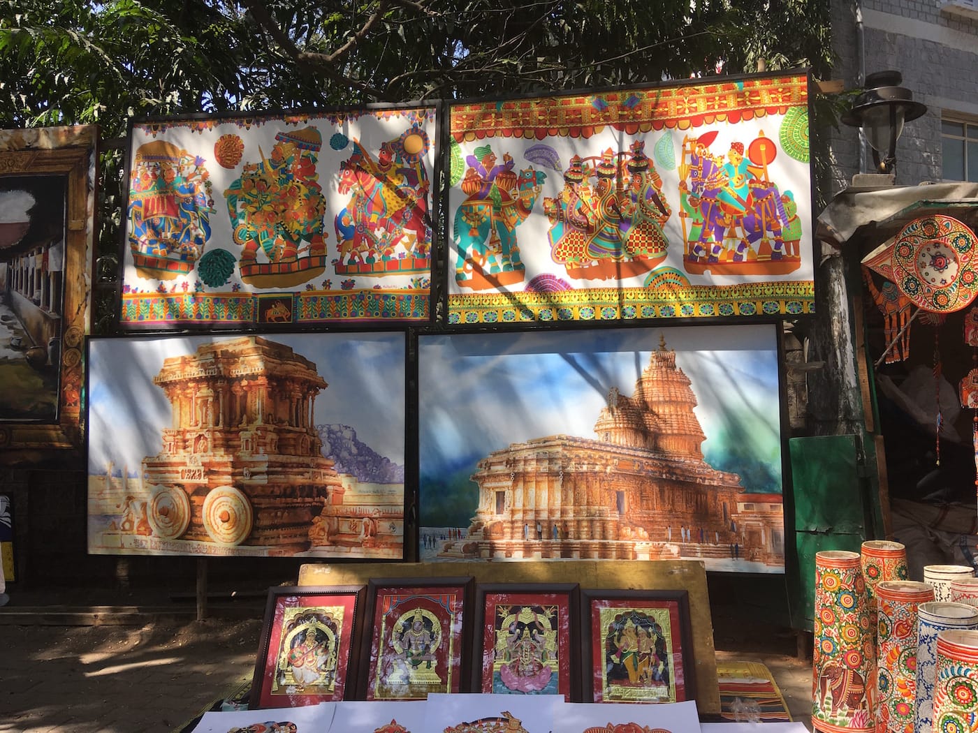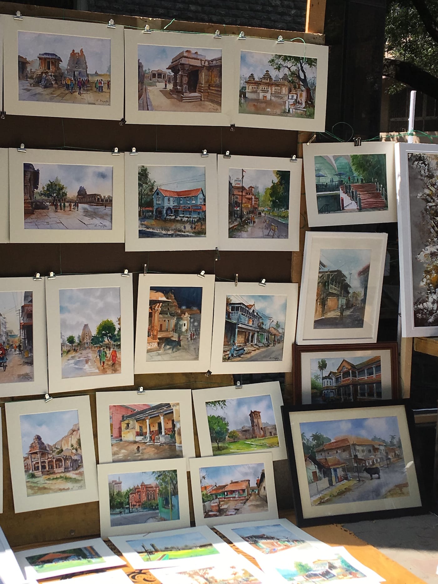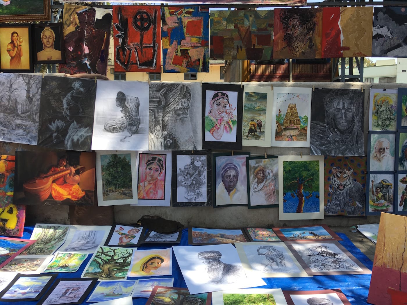 The real action, though, was on the street. Watercolor landscapes, oils, abstracts, hyper-realistic paintings of market scenes, wildlife, and popular tourist destinations, fantastical portraits of popular local movie stars, copies of the Mona Lisa and Raja Ravi Verma, religious paintings, many, many kinds of Buddha paintings, charcoals, and others were in abundance. Also on sale were traditional art styles from different states like Ganjifa paintings, Tanjore paintings, and puppets. The prices for the works were just as spread out across the spectrum, going from a very affordable 100 rupees ($ 1.40) to as high as 600,000 rupees ($ 8,500).