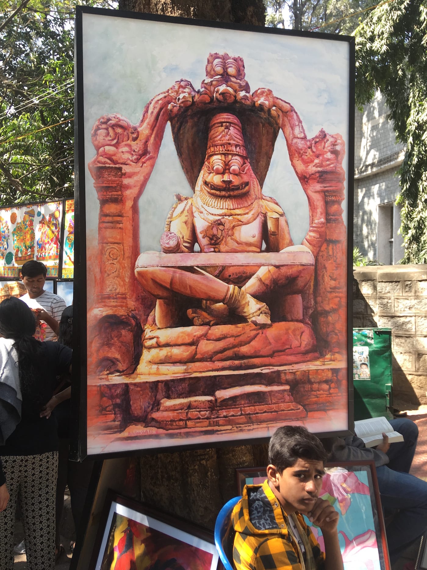 Keeping with the spirit of what the word santhe signifies, Chitra Santhe, held this year on January 6, was a very colorful, packed event. Over 1,500 artists registered to participate, apart from several uncounted others who spread their works out on the pavement. Like in a carnival, there were food kiosks, music, street theater, installations for selfie-seekers, and students from various art colleges doing live portraits and painting tattoos on the faces of children. Like the design of a local market, this art fair was a feast for all the senses.