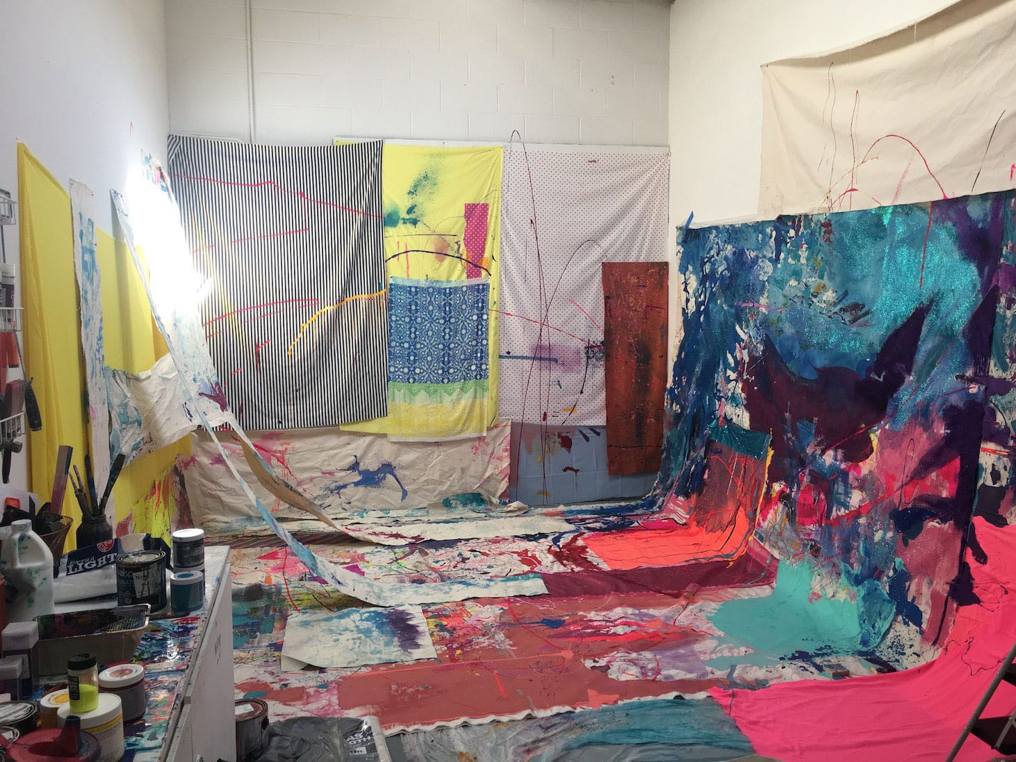 I’m interested in painting (the verb) more than Painting (the noun), and my studio practice fully encompasses this. I paint on paintings that are on top of paintings and canvases that are on top of canvases. I incorporate patterned and sequined fabrics amongst the thick, raw canvas and attempt to capture every moment, every splatter, every drip, every drop, everything that happens in my studio. I believe every moment is important.