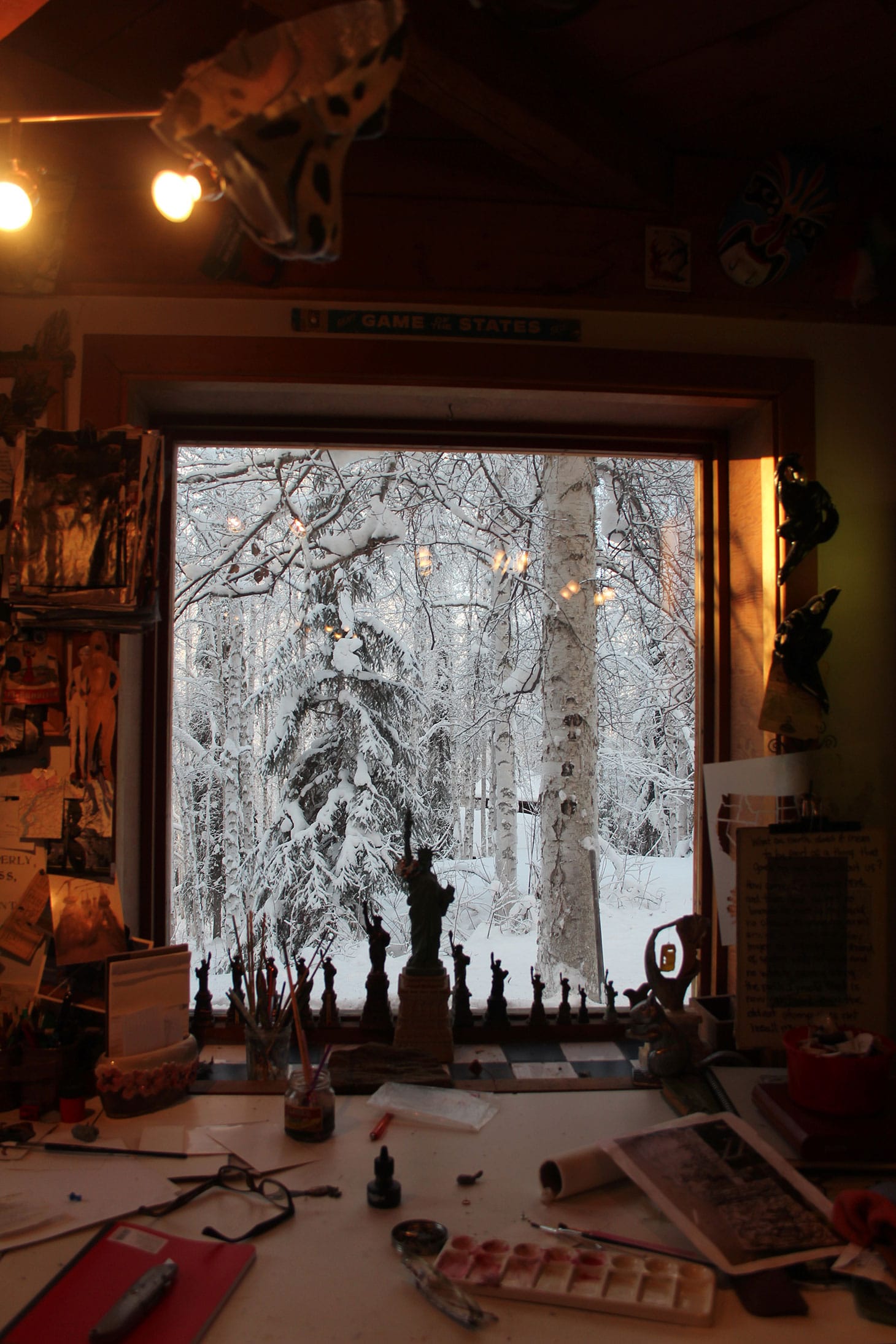 My studio is a dry cabin with a loft located uphill from my home. Looking through the trees, the roof of my house is visible. The studio is where I feel most free. I’ve lined up Statues of Liberty on the windowsill. Both Alaska and the remote location of the studio provide me with a sense of removal and apartness from the rest of the world.