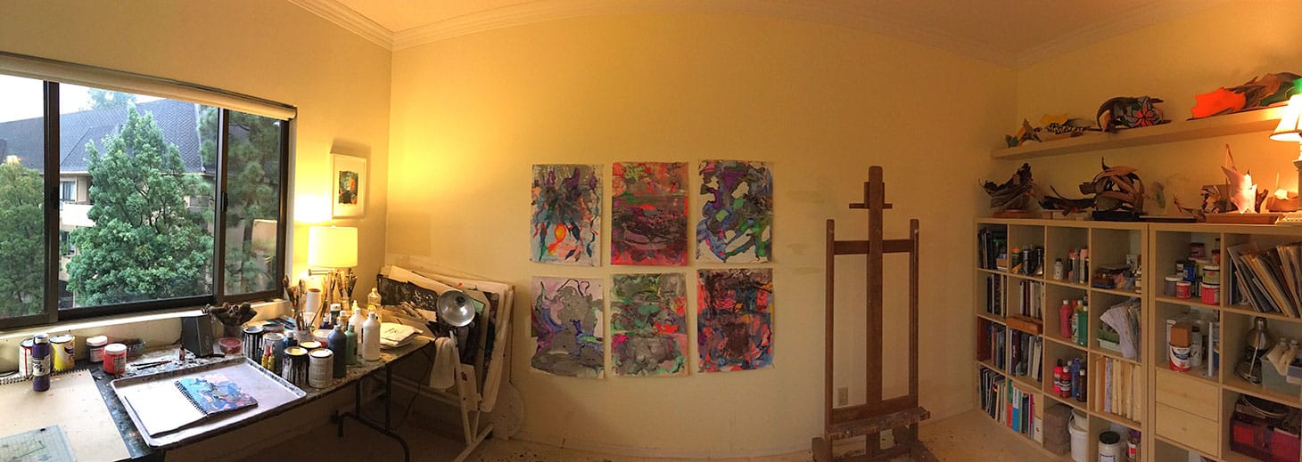 It was a rainy day, and I liked the warm atmosphere in the studio. From left to right: you can see the tables under the window, my favorite spot and the area where I do a lot of my small works. On the wall are a few of my recent paintings that I put there for me to study. You cannot find any of my big brushes, as I have been developing a new technique for two years that does not involve brushes at all. The easel, I had in Paris, and that followed me to the French Alps and then to Los Angeles. I rarely use it anymore, but it has personality. Some of my bark sculptures are on the shelves.