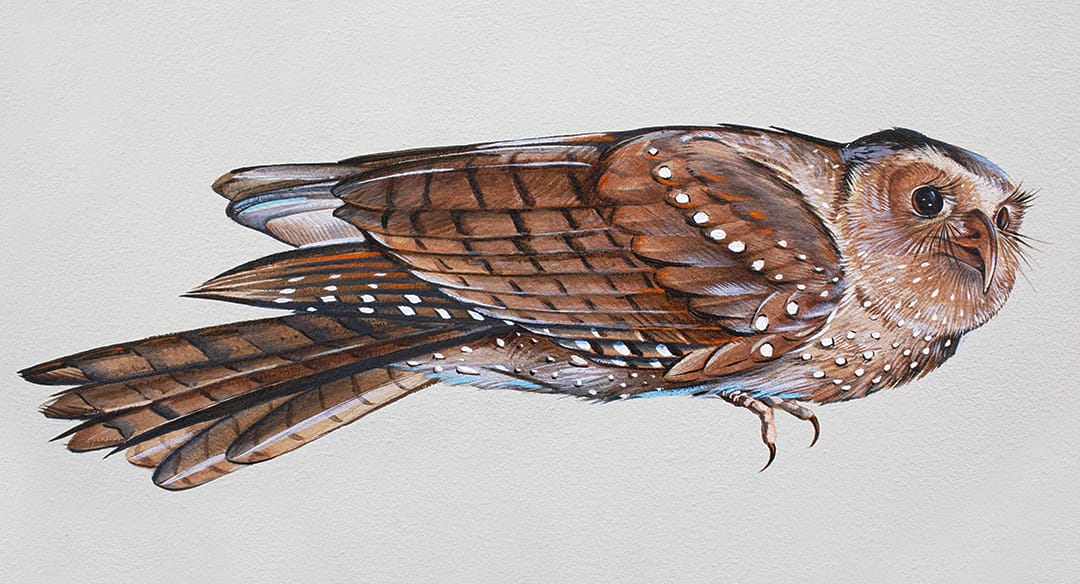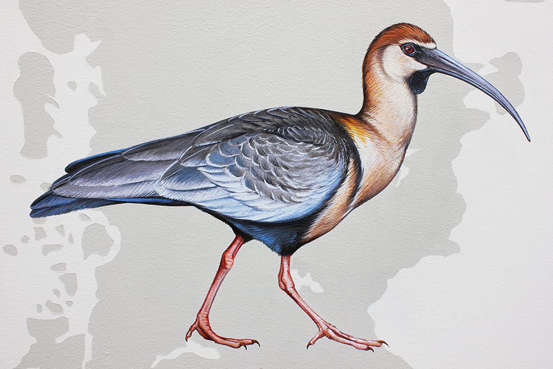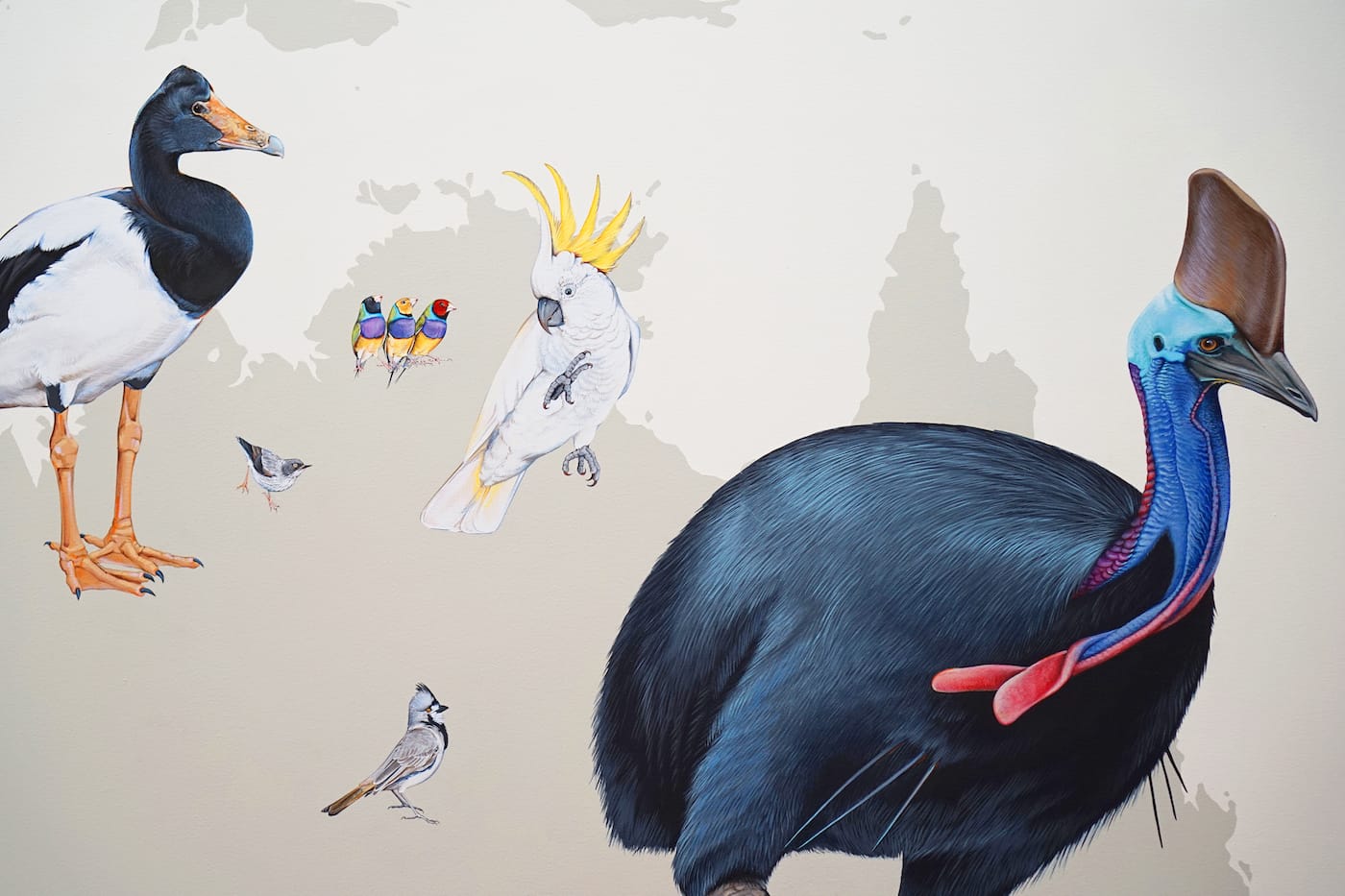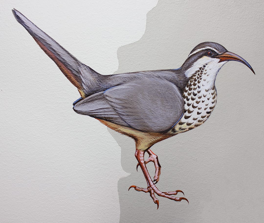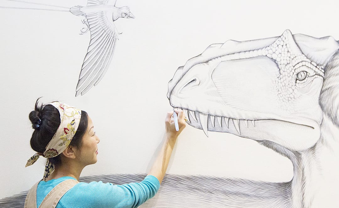 Artist Jane Kim spent three years creating a colossal mural at the Cornell Lab of Ornithology in Ithaca, New York. Arranged across a map of the world are birds painted life-size, from a Great Gray Owl soaring over Europe to the Common Ostrich, the world’s largest living bird, gazing with big bright eyes at the viewer. Each is part of a sprawling narrative on bird diversity and 375 million years of their evolution.