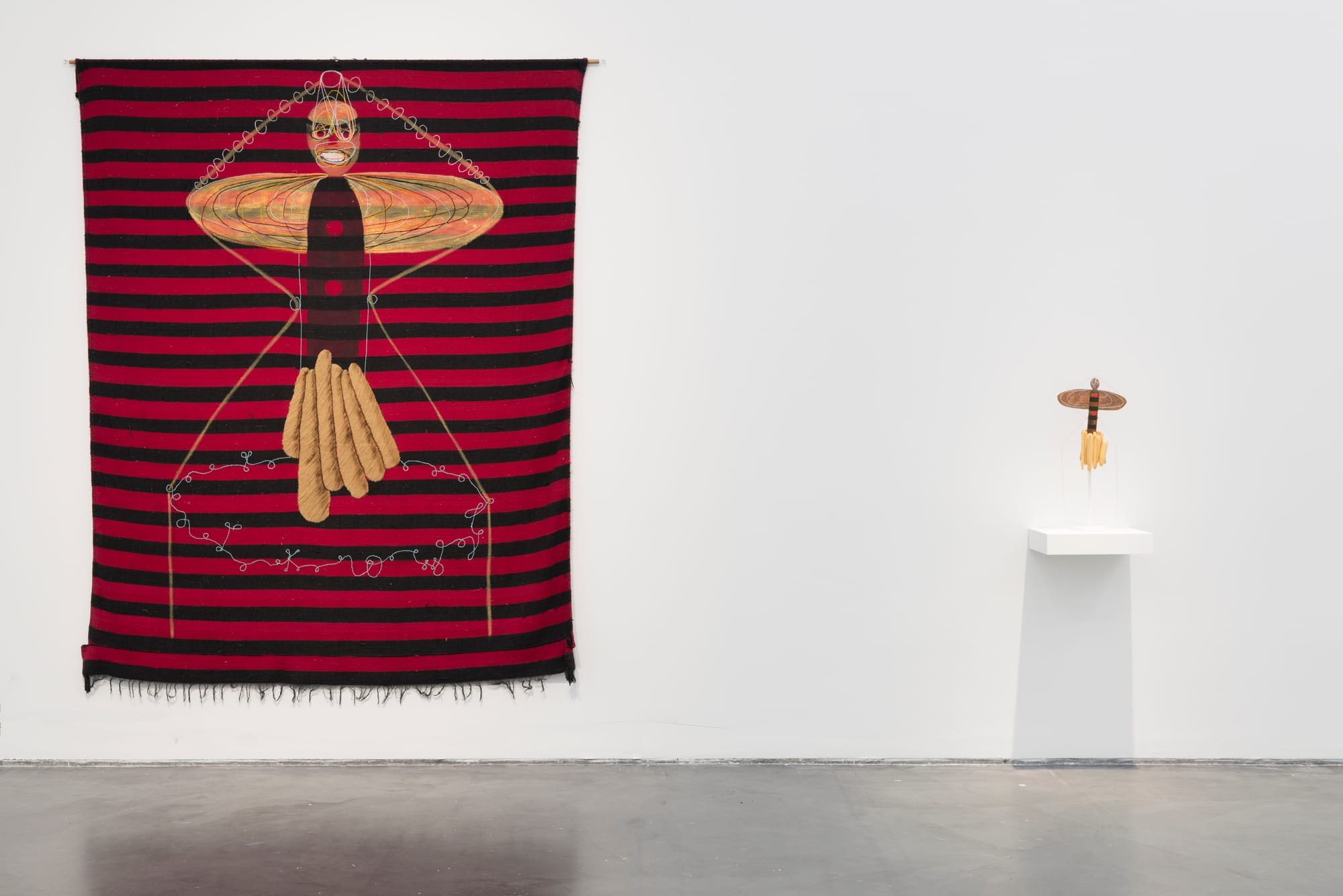 Evidently, this commitment runs in the family: David’s mother was a dressmaker, his father a furniture maker, his sister designs fabric, and his brother works leather. Yet his intuitive process and his attraction to figuration imbue his works with a totemic or fetishistic sensibility. In the wool tapestry “Evenly Suspended Attention IV” (2004), a figure both humanoid and curiously bee-like hovers against a powerfully rhythmic red and black background. It manifests as both alien and strangely familiar, conjuring tribal arts. The image proved compelling enough for David to reprise it a year later, in “Sodulater” (2005), this time as a small sculptural assemblage of copper, wood, paper, and paint. The shift in medium renders the image even more totemic and haunting.
