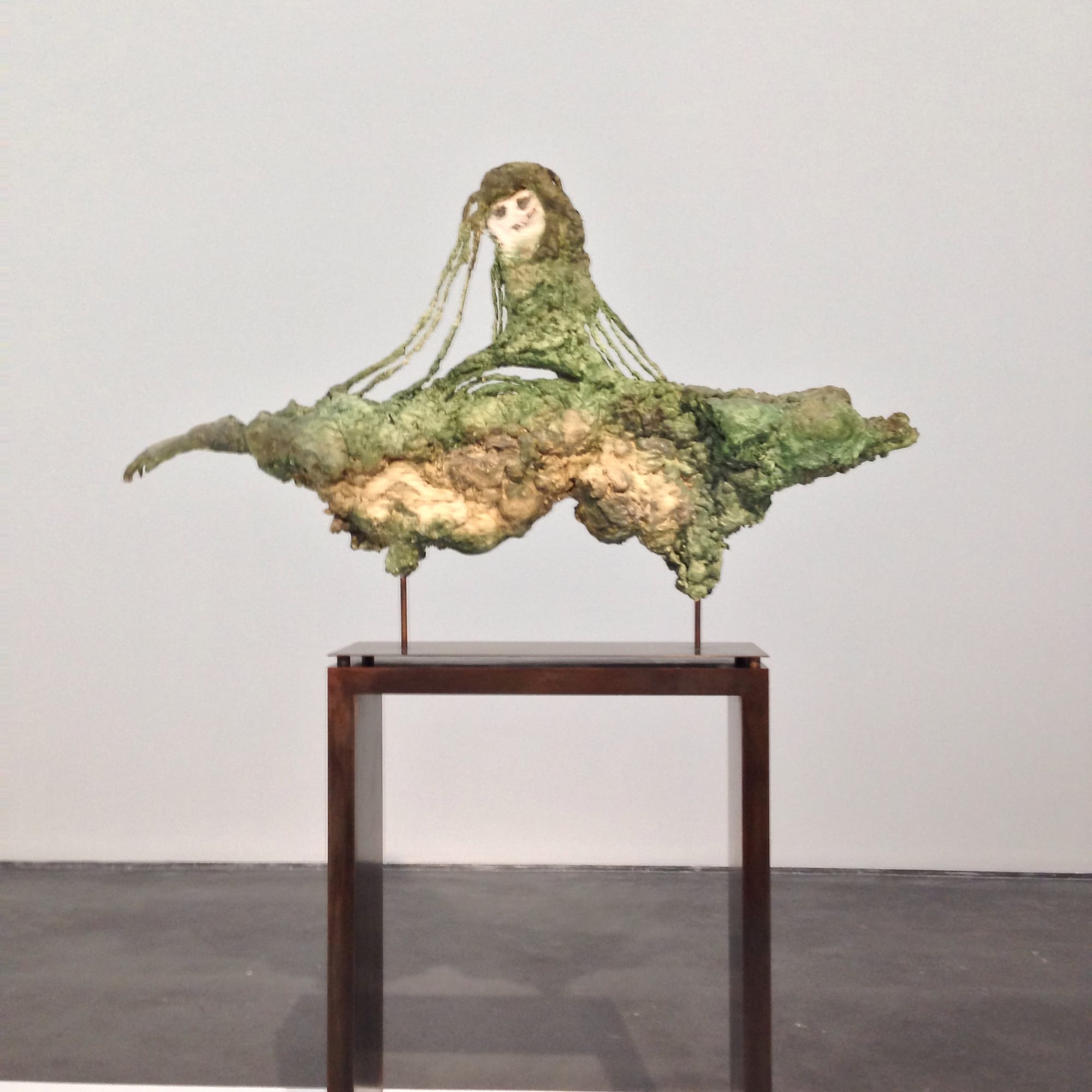 Similarly haunting is “Untitled” (2017) a small Jesmonite head attached to a stick figure made of metal wire and hair, held in wire grid embedded in large white rubber screen. It seems both helpless and serene, like the Paul Klee’s 1920 monoprint “Angelus Novus,” the image that inspired Walter Benjamin’s reflections on the Angel of History from his 1940 essay On the Concept of History. Another Jesmonite face dominates the sculpture“Restless” (2017), in which brass wires and organic fronds compose a horizontal form that recalls with minimal means the architecture of the human body. In this work, the face seems to express agony, despair, and pain.