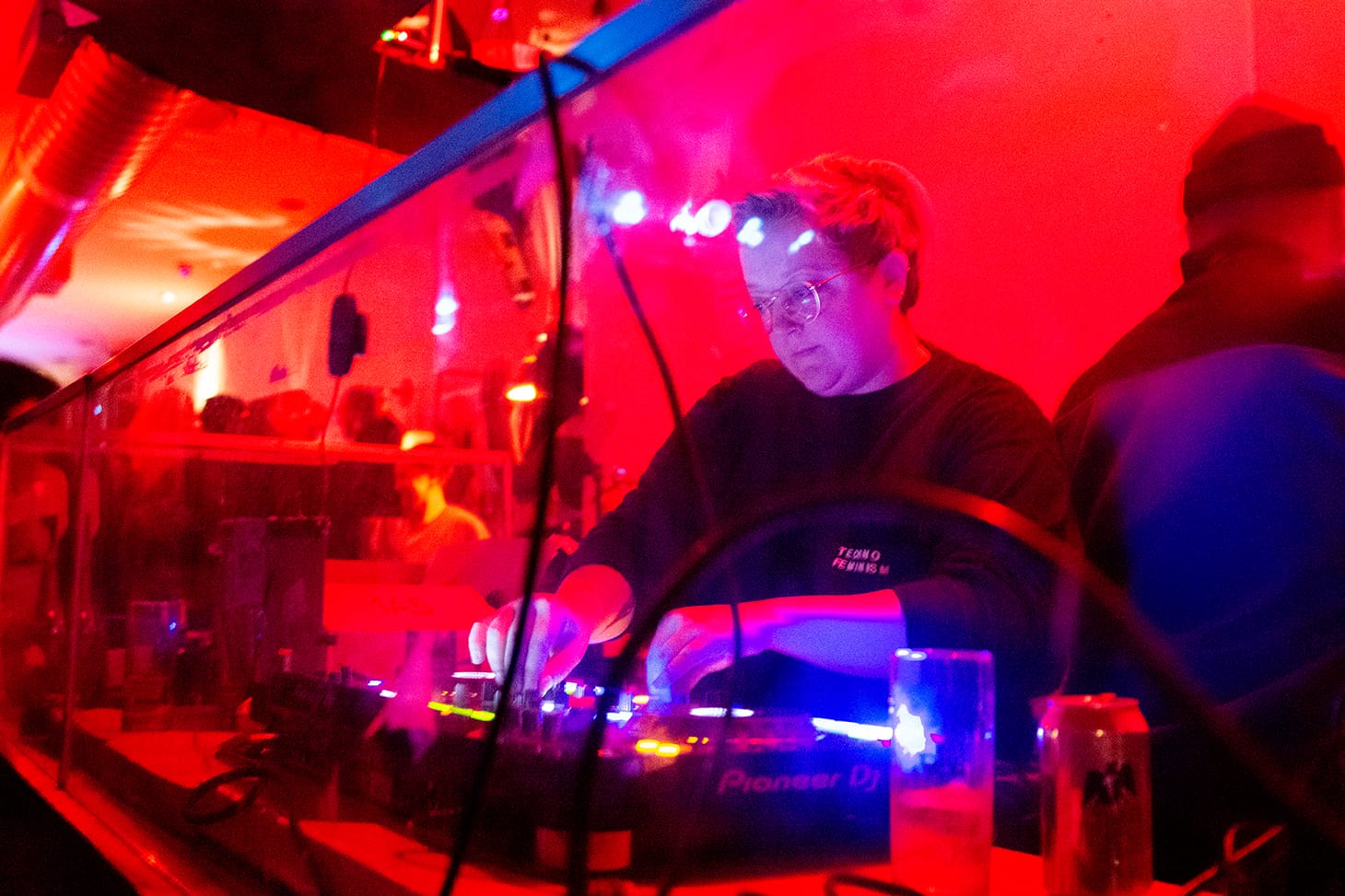Each set also features a lip-sync performance by guest drag artist Lucy Balls, whose particularly noteworthy performance of Frank Ocean’s “Moon River” bathes the room in literal and figurative blue light. Her performances are punctuated by a soundscape created by aural artist DJ Jessamess. In between sets, people dance and drink the same way they would if there were pop divas exiting the speakers instead of deep house beats. A go-go dancer named dreamboi dances to the music onstage while selling Untitled’s art prints and wearing giant black patent leather boots and a swirled yellow wig.