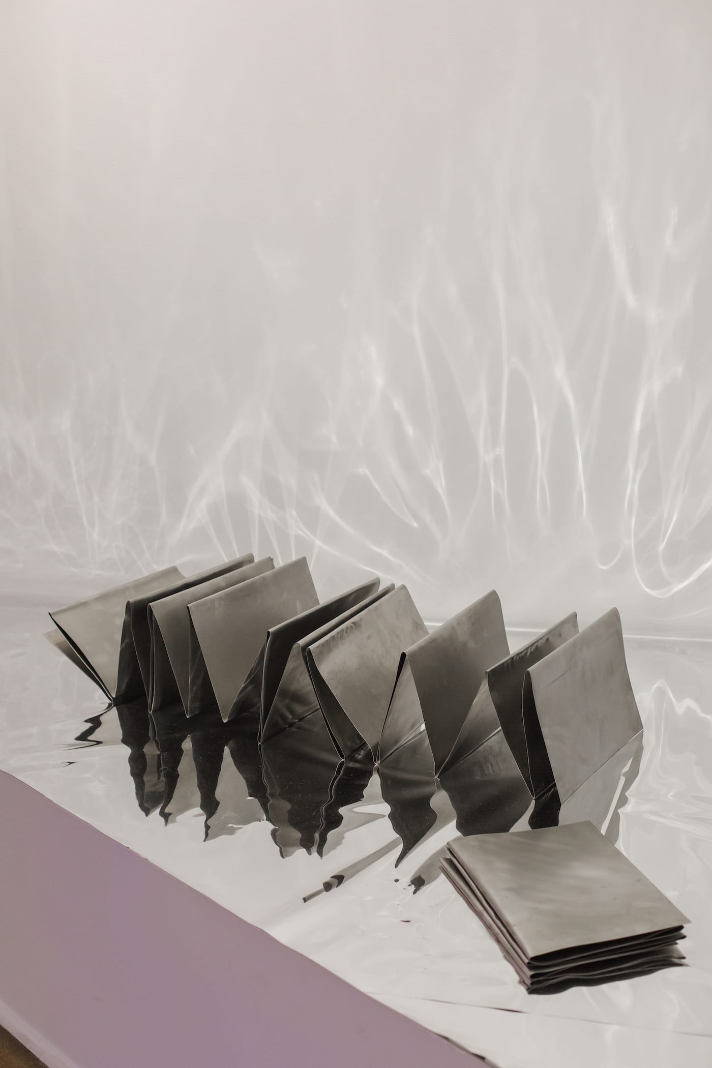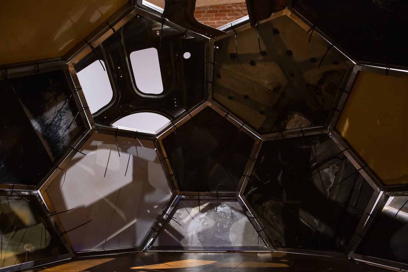 In an interview at the museum, Cortez said she was drawn to the organic nature of raw steel — the way it reacts to its environment, to humans in the space, and to plants. Welding reminds her of sewing, she explained, how the precise handiwork in manipulating the material feels like the work of a seamstress. In one corner of the exhibition, a geometric dome has been built from car parts the artist diligently sourced from junk yards and melded together into interchangeable pieces. In another, latrines have been crafted out of steel, zip ties synching together a dome overhead. Maintaining imperfections, Cortez makes visible the labor required for each object, an homage, she explains, to the labor of immigrants who often take jobs they are not trained to do, but nevertheless excel at.
