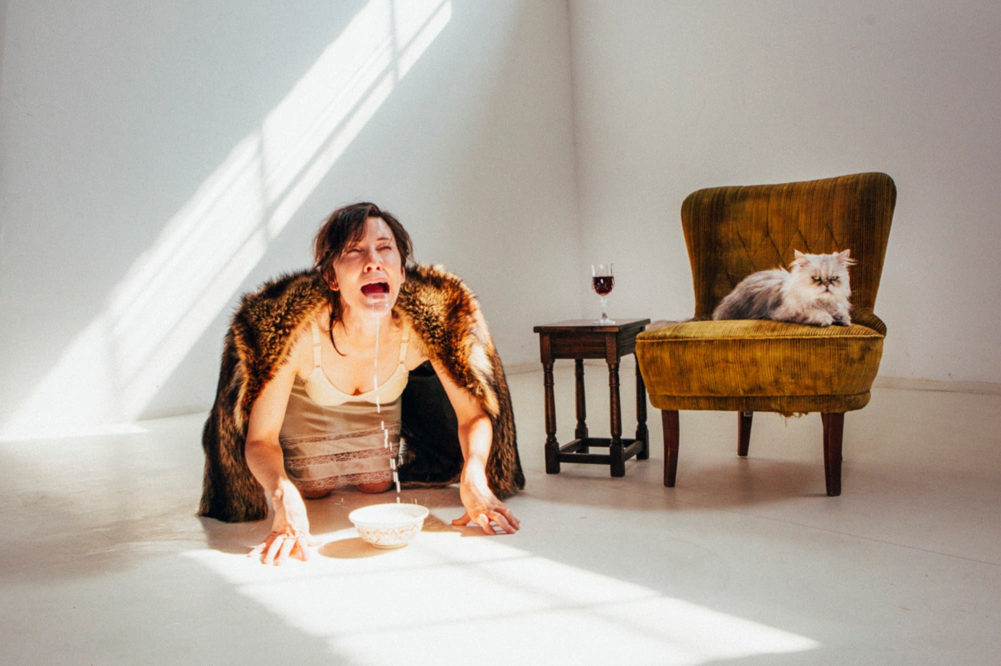 The show alternates between tackling more recent documentaries (turning Wild Wild Country into “Batshit Valley,” or Jiro Dreams of Sushi into “Juan Loves Chicken and Rice”) and classic ones (Grey Gardens becomes “Sandy Passage,” Stop Making Sense becomes “Final Transmission”). Whatever the subject, it pours effort into imitating the original’s look. In the case of “Waiting for the Artist,” the basis is the 2012 film Marina Abramović: The Artist is Present. Directed by Matthew Akers, it both profiled Abramović and went behind the scenes of her 2010 MoMA show of the same name, in which she sat perfectly still while a parade of different patrons were ushered in to sit across from her. (In “Waiting for the Artist,” this is turned into Barta sitting in a facsimile toilet stall, with visitors given the opportunity to pass her some toilet paper. The piece is called “A Stranger in Need.”)