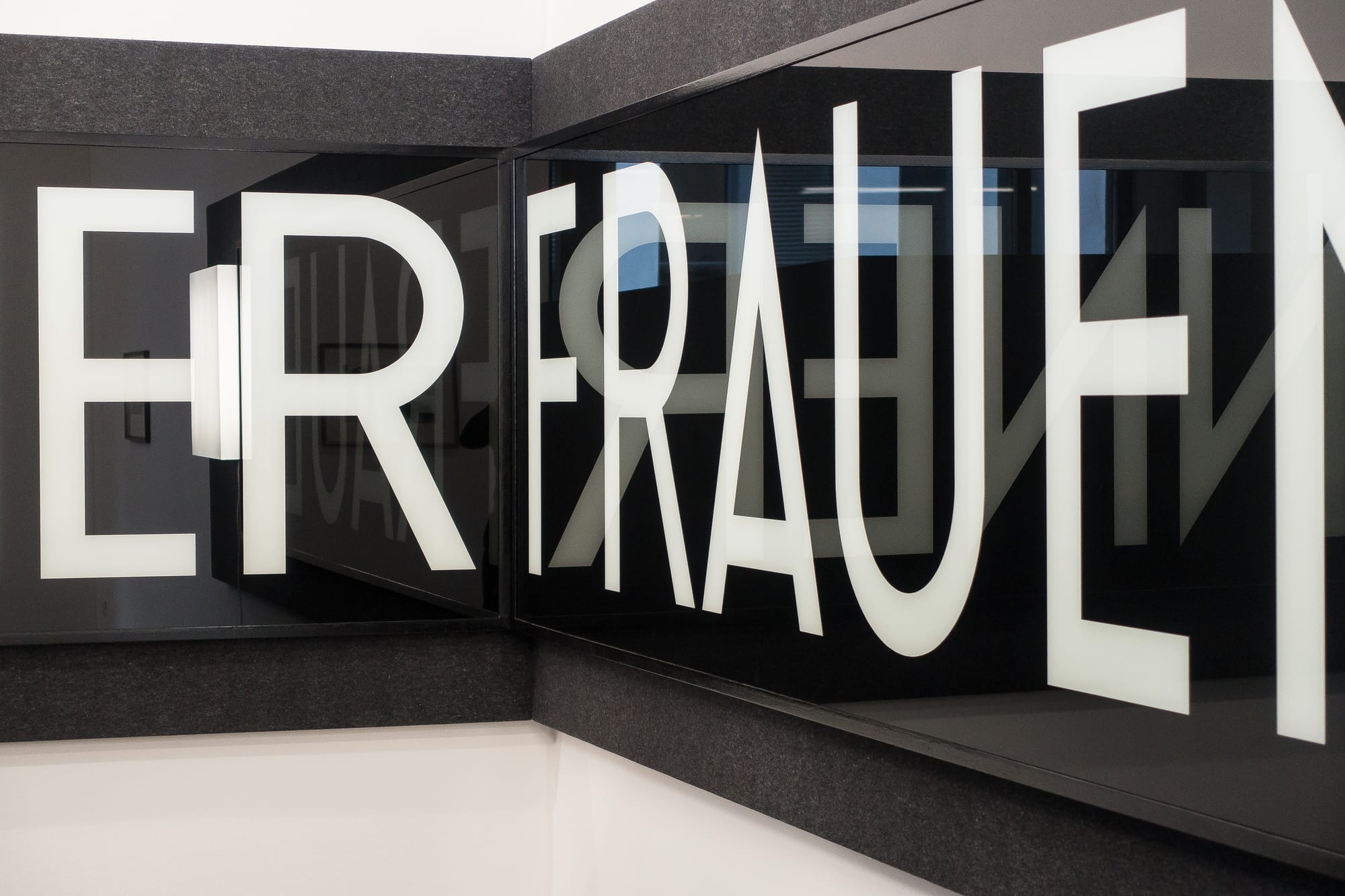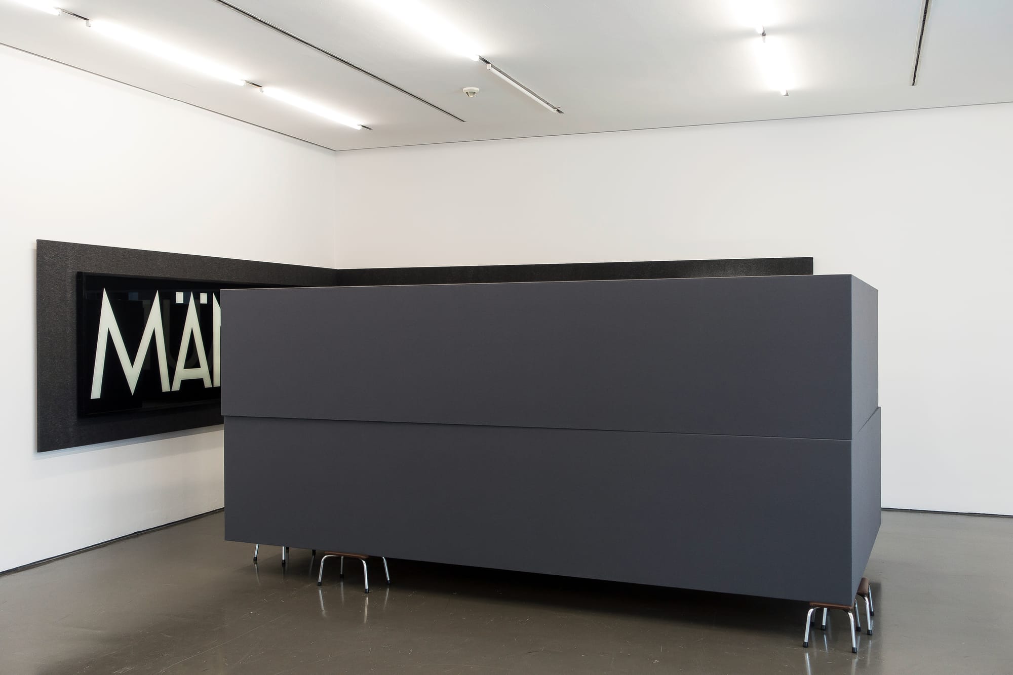 Glossy surfaces, glass, and mirrors serve as powerful motifs in Mucha’s work. Seeing our reflection creates “a form of silence and emptiness and loneliness,” he said in an interview for Bits & Pieces Put Together to Present a Semblance of a Whole, a 2005 collection catalogue for the Walker Art Center in Minneapolis. The way Mucha’s reflective sculptures are hung at Sprüth Magers ensures that while looking at one work, viewers are aware of the others in the space and our presence among them. In “Oderin / Untitled (MÄNNER FRAUEN), [1987] 1987/1981,” which takes up the rest of the first room, an imposing gray felt box is supported by six comically small footstools. When walking around it, the gap narrows disconcertingly at one point between the box and the gallery’s walls, forcing us close to a painting that hangs behind glass in the corner and has the words “MÄNNER” (men) and “FRAUEN” (women) written in huge white letters on a slick black background. A white lightbox appears after “Frauen,” like a punctuation mark providing an additional moment of contemplation; it’s powered by a roll of cabling tied with packing tape printed with the word “fragile.”