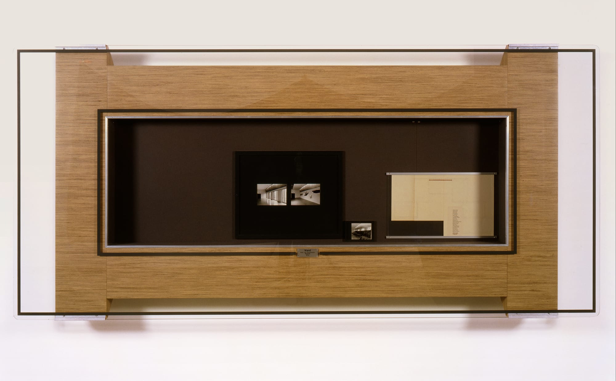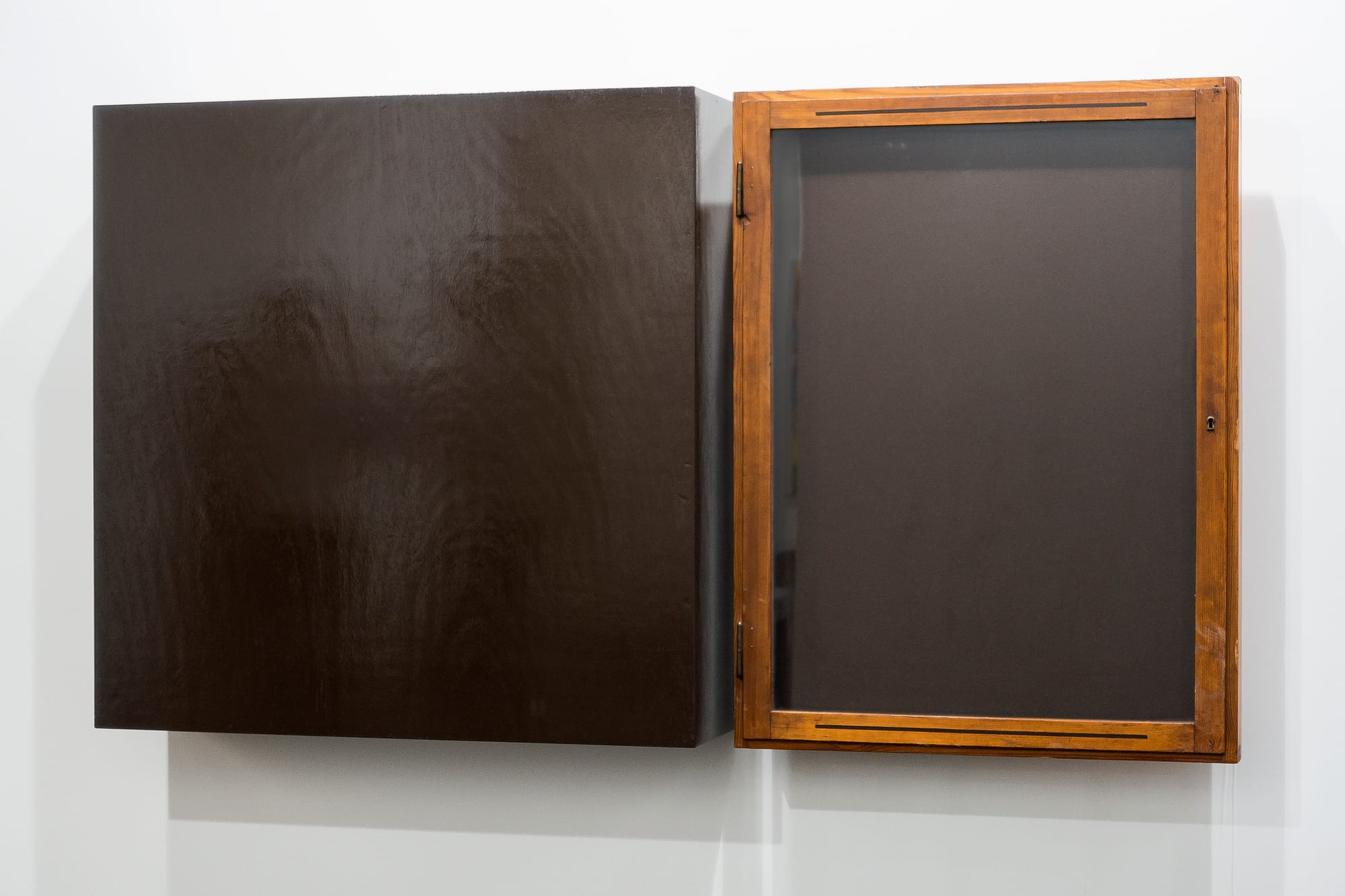 Mucha’s purest exploration of reflection appears on the gallery’s second floor. In the diptych “Bohmte, 1985,” a glossy brown-painted square is placed beside a glass-fronted wooden cabinet lined with brown felt. In the first, you can see your blurred silhouette. In the second, you can see your defined tinted reflection, as well as another diptych in the same room. For “Untitled (Wand – Kunst- und Museumsverein – Wuppertal – 1978) / Untitled (Isolde Wawrin – Ohne Titel (Objekt), 1978), [2019] 1985,” Mucha frames Isolde Wawrin’s amoeba-shaped green painting, patterned with blue blotchy brushstrokes, above an aluminum box frame. Inside it are black-and-white photographs documenting the 1978 exhibition in which Wawrin’s painting was shown alongside a breeze-block sculpture by Mucha. A page taken from the show’s catalogue listing the participating artists, with Wawrin’s name underlined in red pen, is meticulously mounted next to the photos.