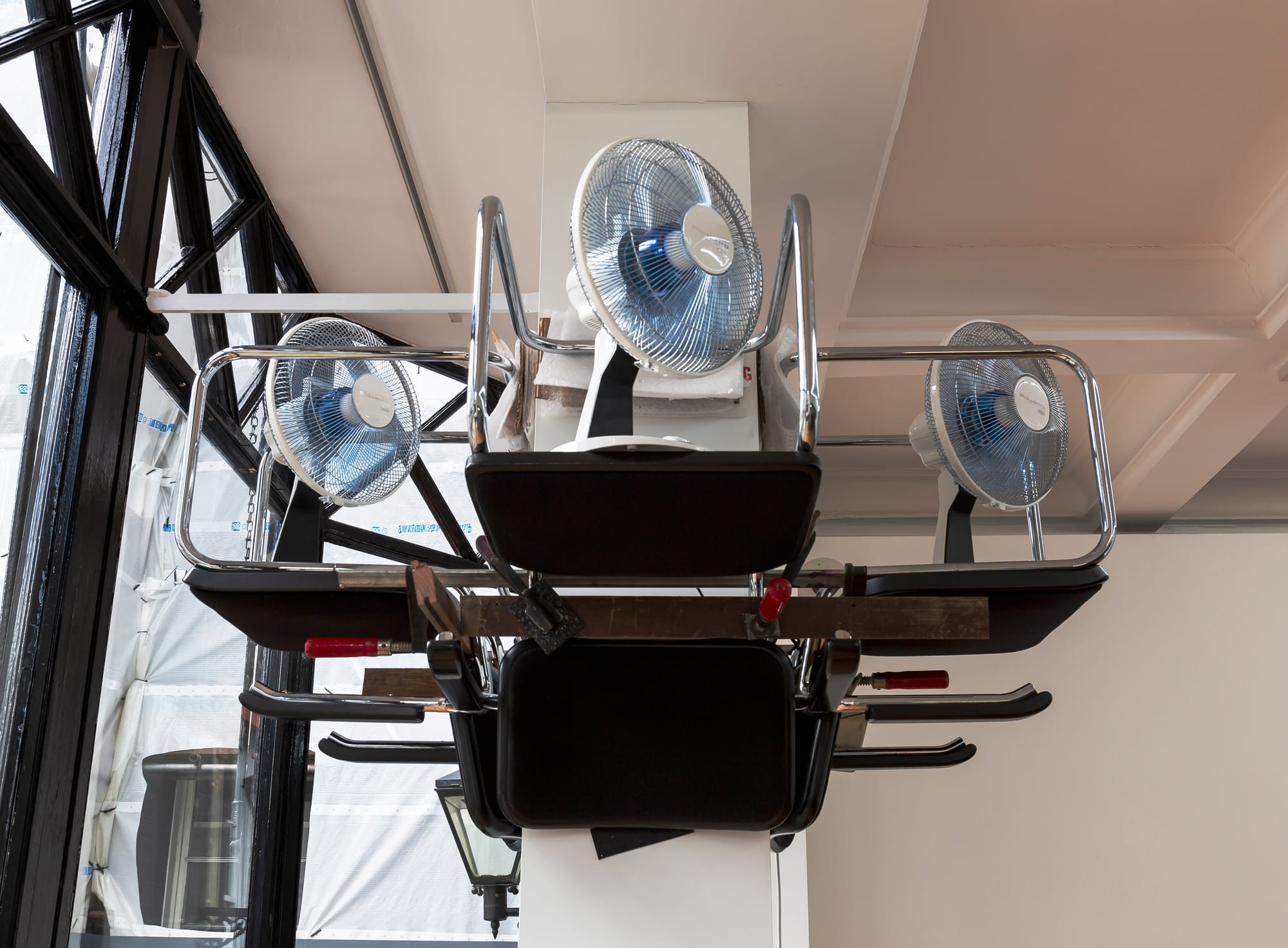 Before studying at the Düsseldorf Academy of Art, Mucha trained as a blacksmith — and in the exhibition’s first room, the sculpture “Wind and Too-Tall Towers, [2019] 1982” showcases his playful navigation of objects and machines. Above our heads are four inverted office chairs clamped to a suspended wood frame, which wraps around an existing structural pillar in the gallery. Positioned on each chair are four functioning electric desk fans; nestled in between are plugs, sockets, extension cables, folded cardboard, and plastic. The sculpture looks like a prototype, with its workings-out on display. The title suggests something more sinister, though: high-rise buildings causing wind tunnels that buffet passers-by.