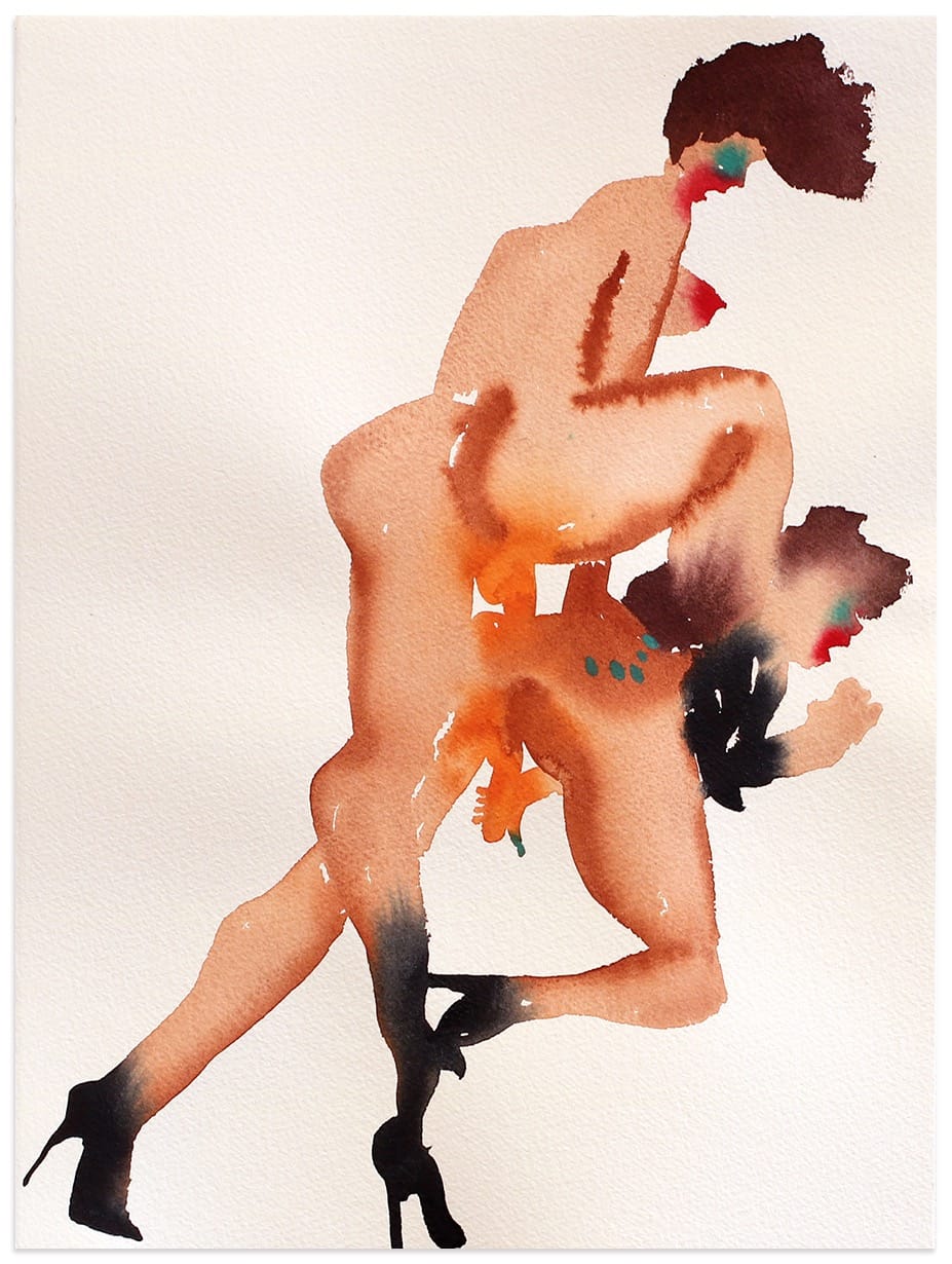 There is something about the sexual act that Nadine Faraj gets exactly right in her inexact, amorphous blending of bodies engaged in flagrant erotic intercourse. Her technique, which is to work wet-in-wet with watercolors on paper, evokes the misty arcs of pleasure and the deep, deep depths of hunger that the act itself taps — at least when it fulfills all its promises, which tend to be somewhere just north of occasionally. With her figures Faraj reveals our desire to explore the body’s penetralia, to cajole and seduce, to dominate or be submissive, to find and test the limits of another’s body, to discover our own boundaries, and to watch others do the same.
