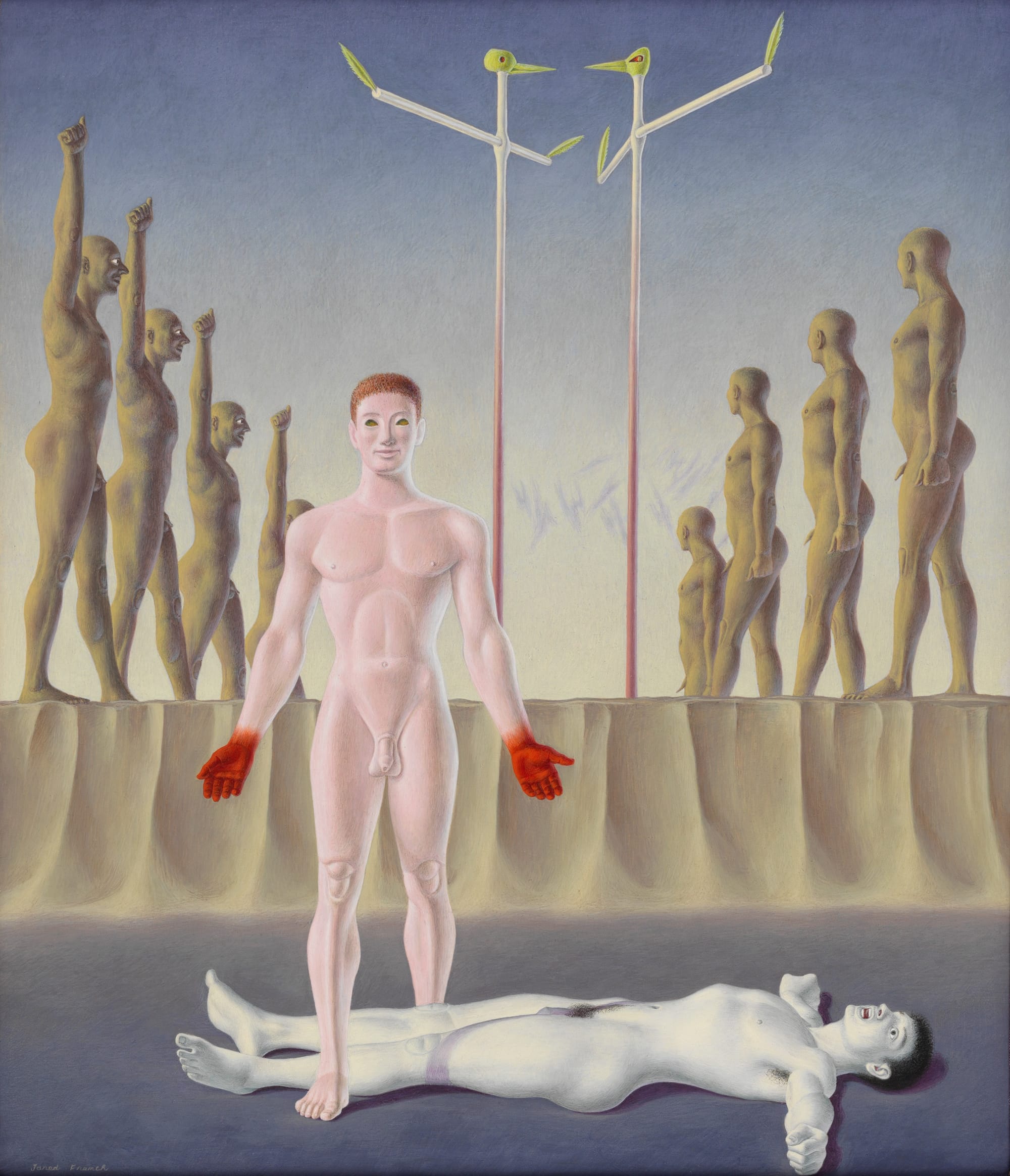 Thankfully, there are some freakier, surreal works, like Jared French’s “Murder” (1942). An idealized male nude with bloody hands stands over a screaming male nude. The work is intentionally cryptic but the message isn’t lost on anyone. French has often been left out of art history despite the high quality of his work, likely because he was too homoerotic for the men writing and curating.